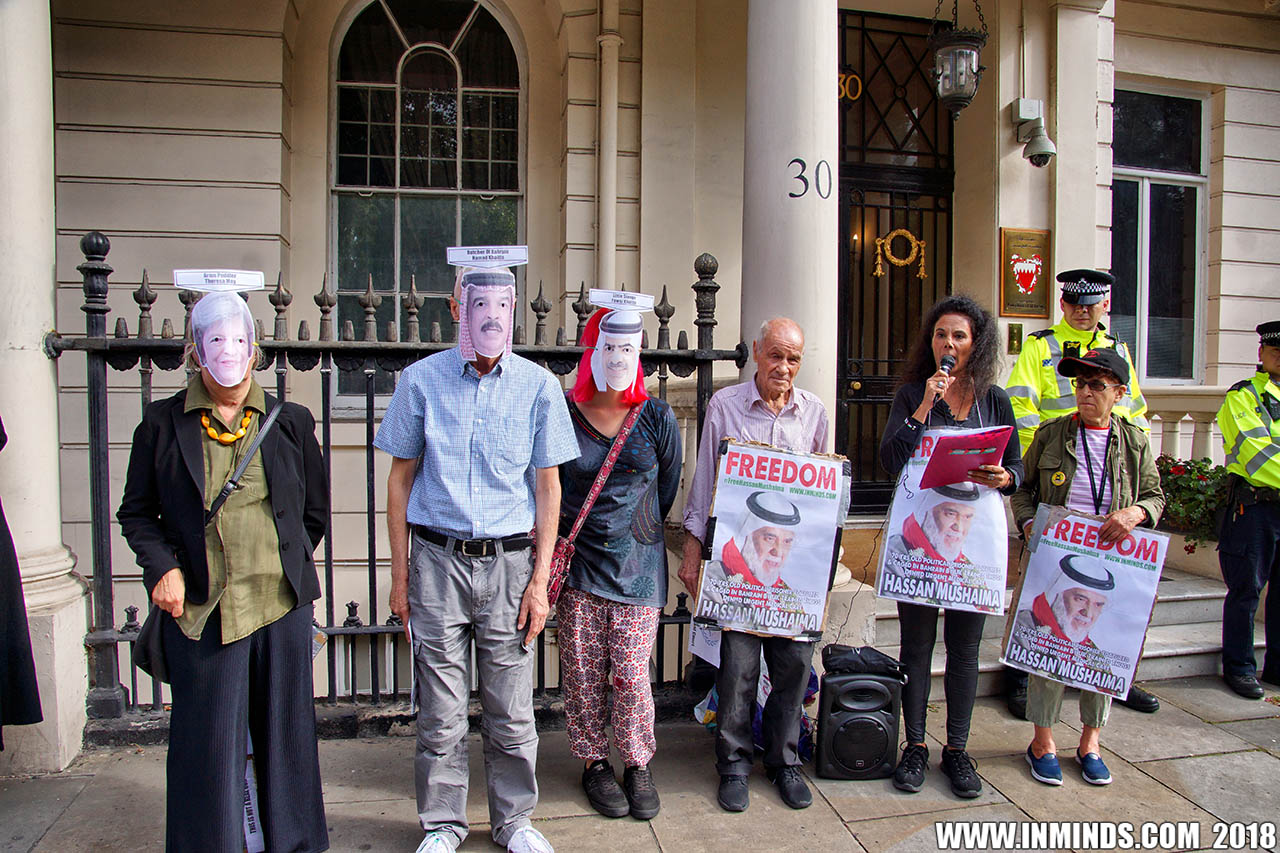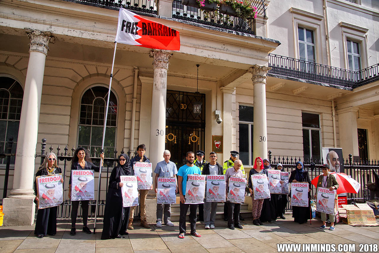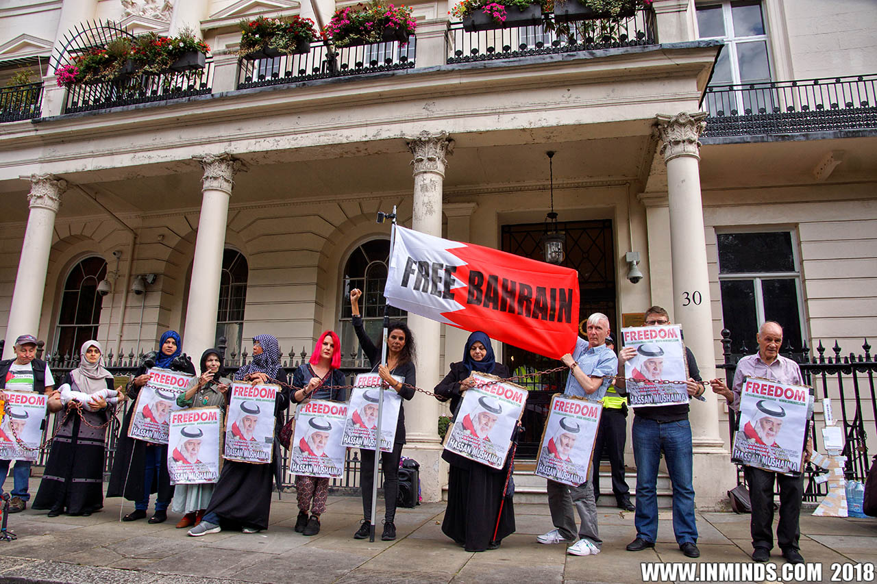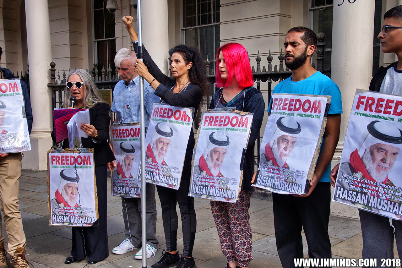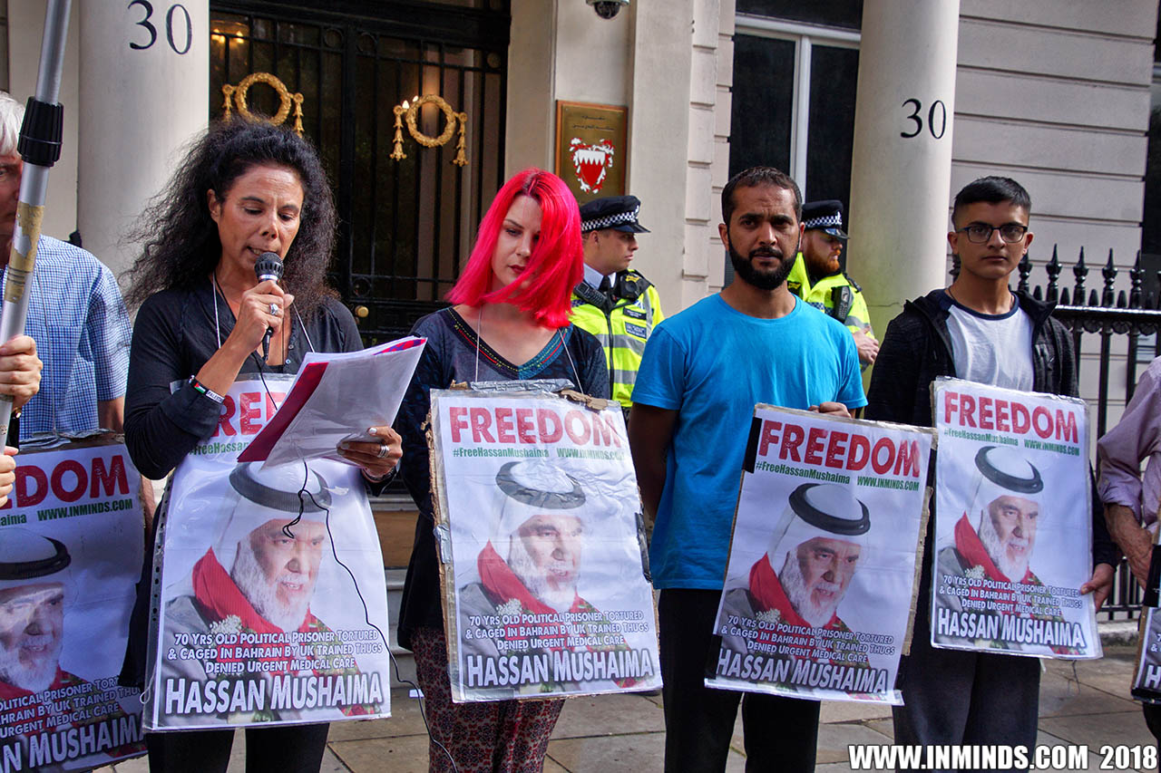 inminds 15 August 2018  Inminds vigil outside bahrain embassy demands MET police arrest perpetrators from embassy who attacked hunger striker Ali Mushaima #FreeHassanMushaima #الأستاذ_حسن_مشيمع