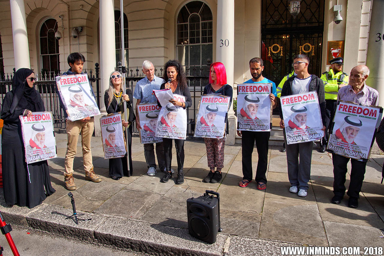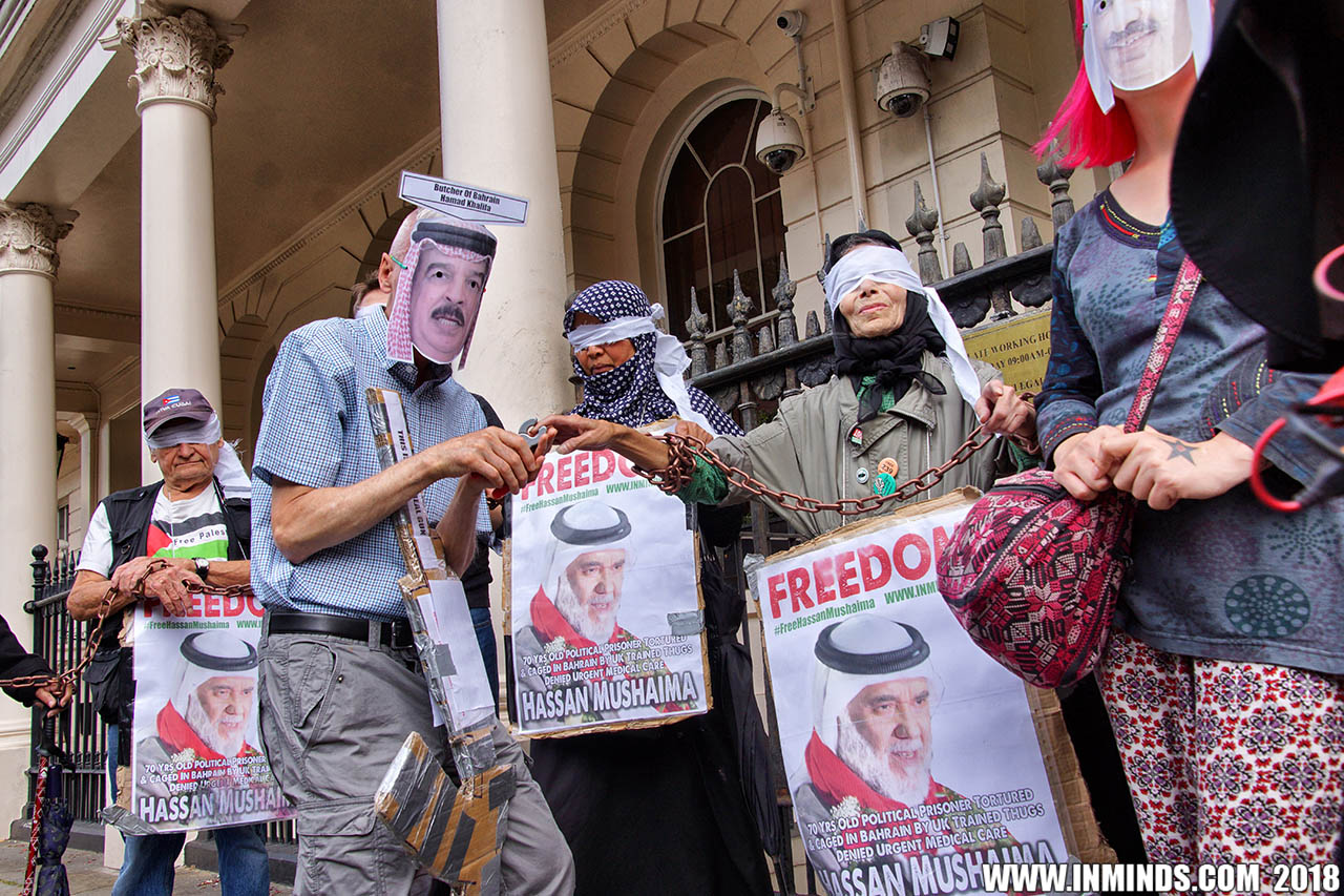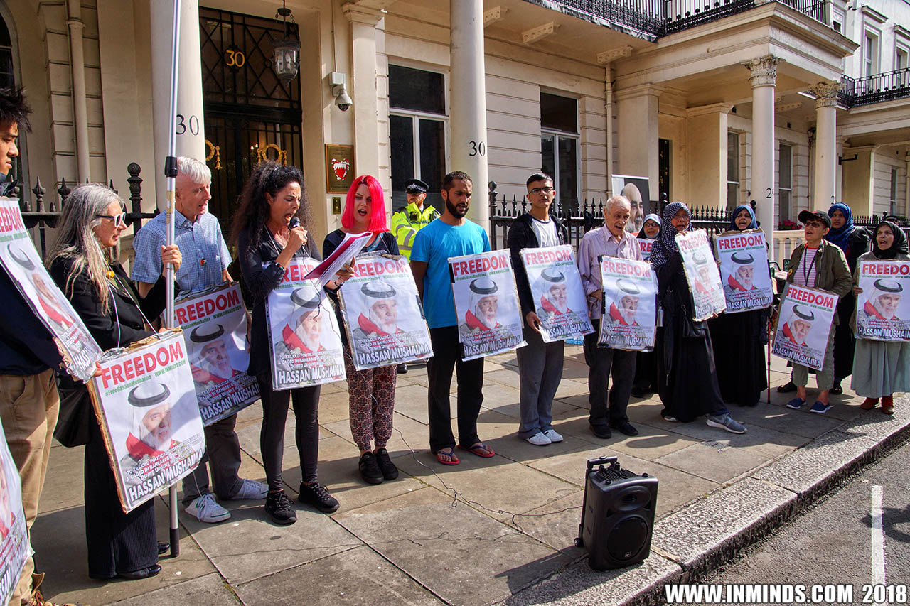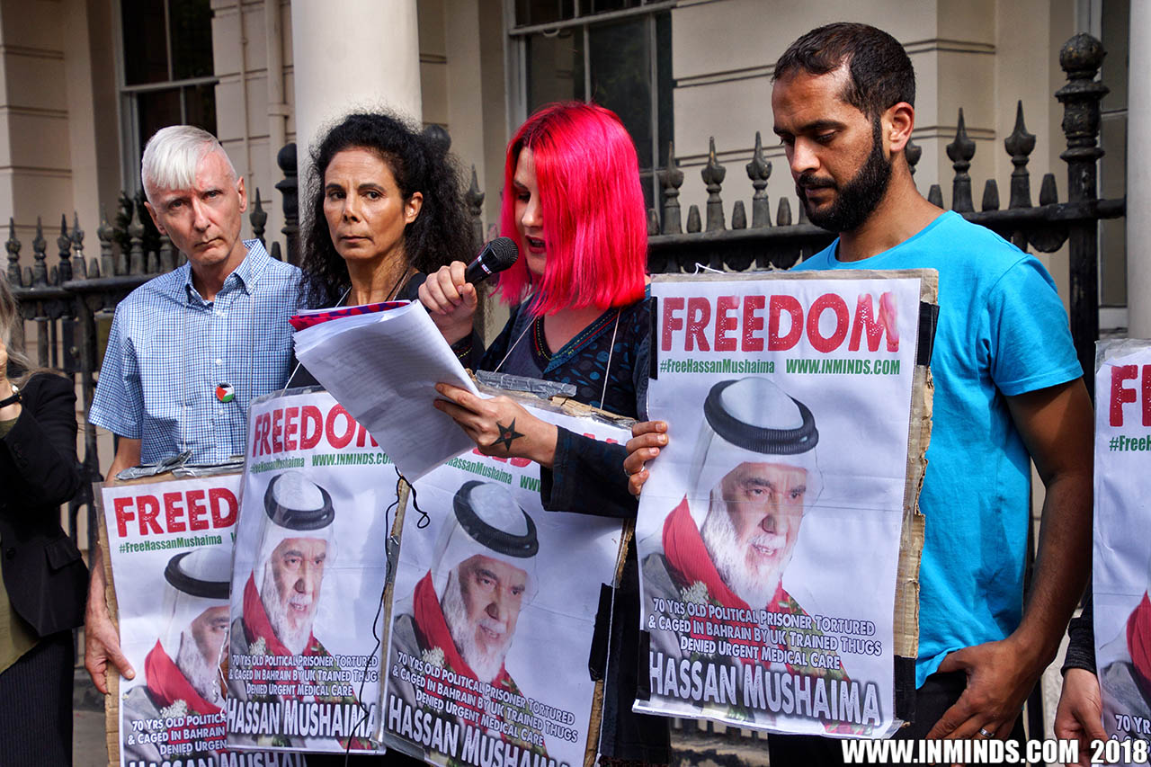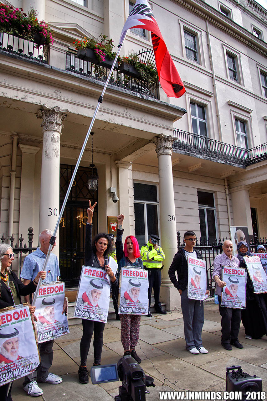 inminds 15 August 2018  Inminds vigil outside bahrain embassy demands MET police arrest perpetrators from embassy who attacked hunger striker Ali Mushaima #FreeHassanMushaima #الأستاذ_حسن_مشيمع