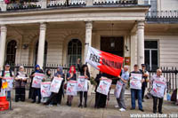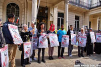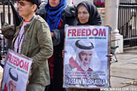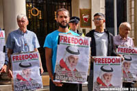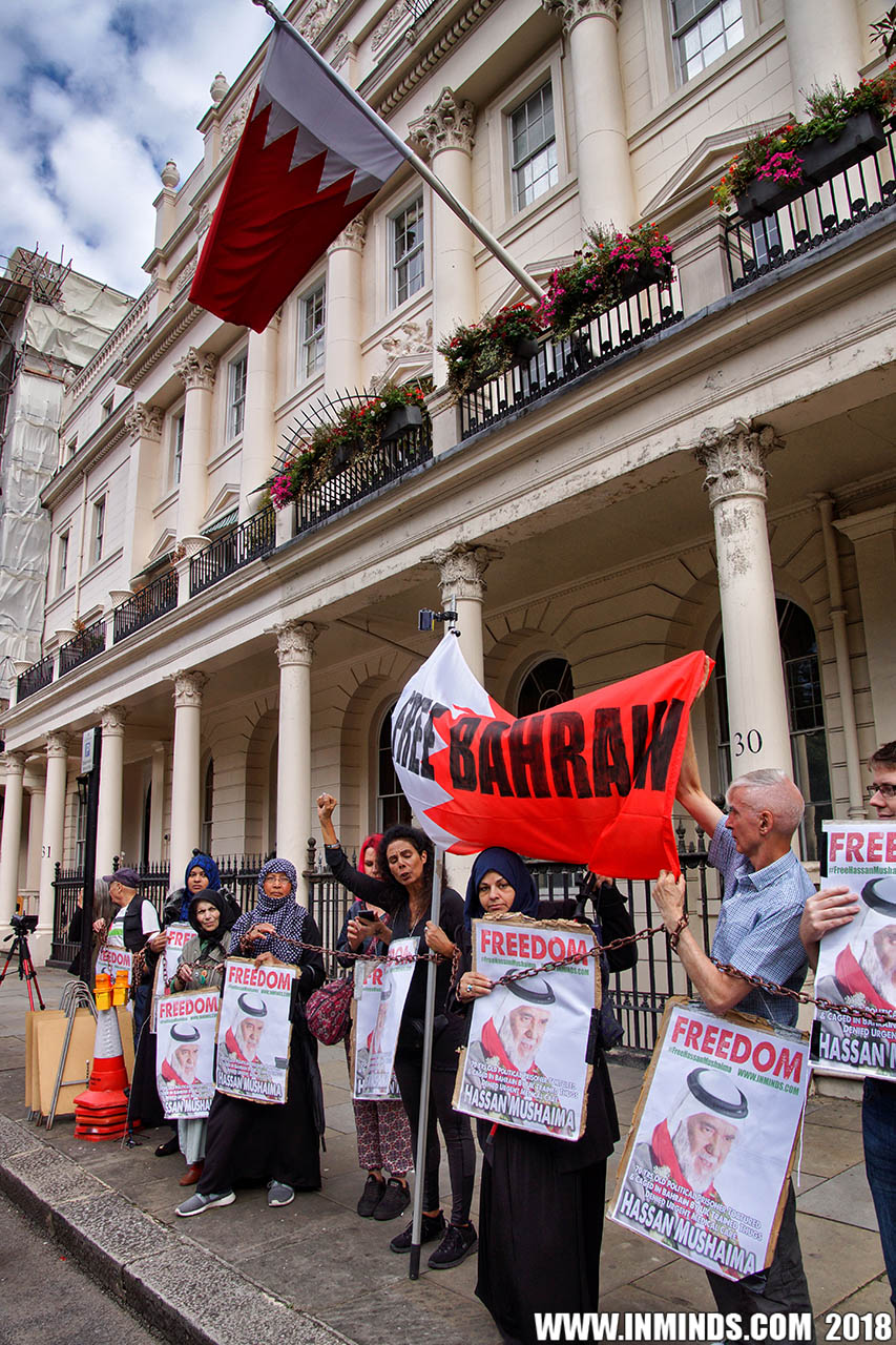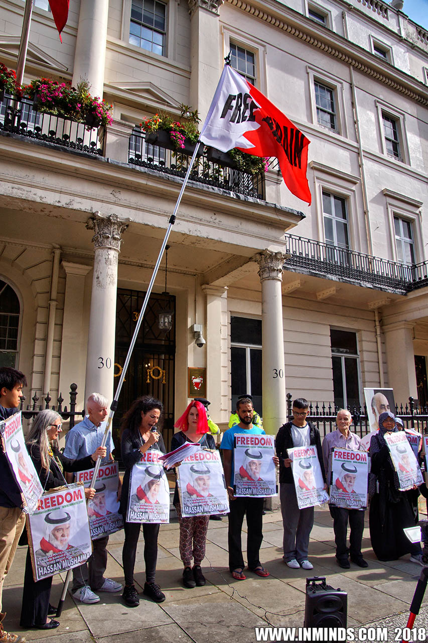 Free Bahrain! Inminds vigil outside bahrain embassy demands MET police arrest perpetrators from embassy who attacked hunger striker Ali Mushaima #FreeHassanMushaima #الأستاذ_حسن_مشيمع