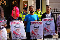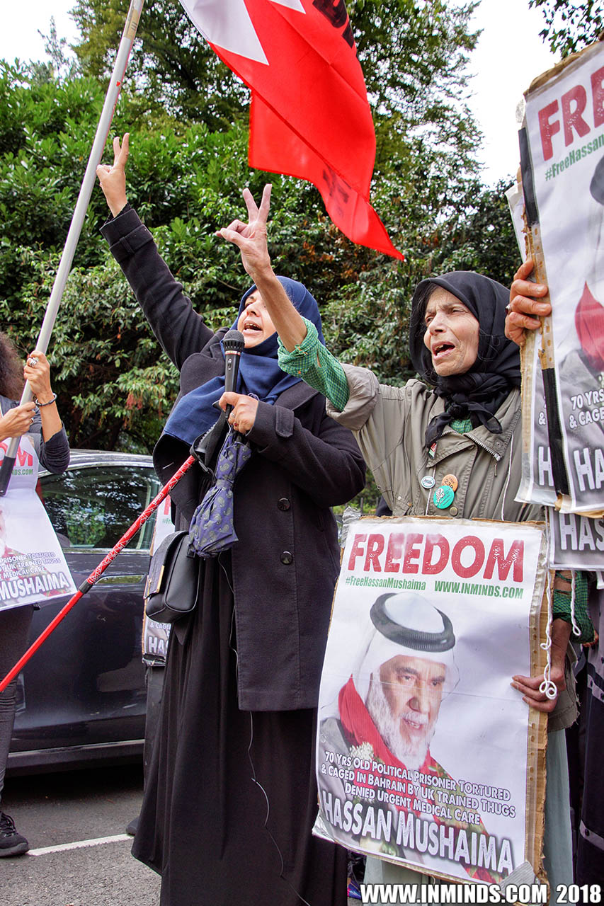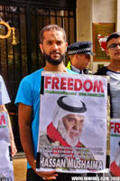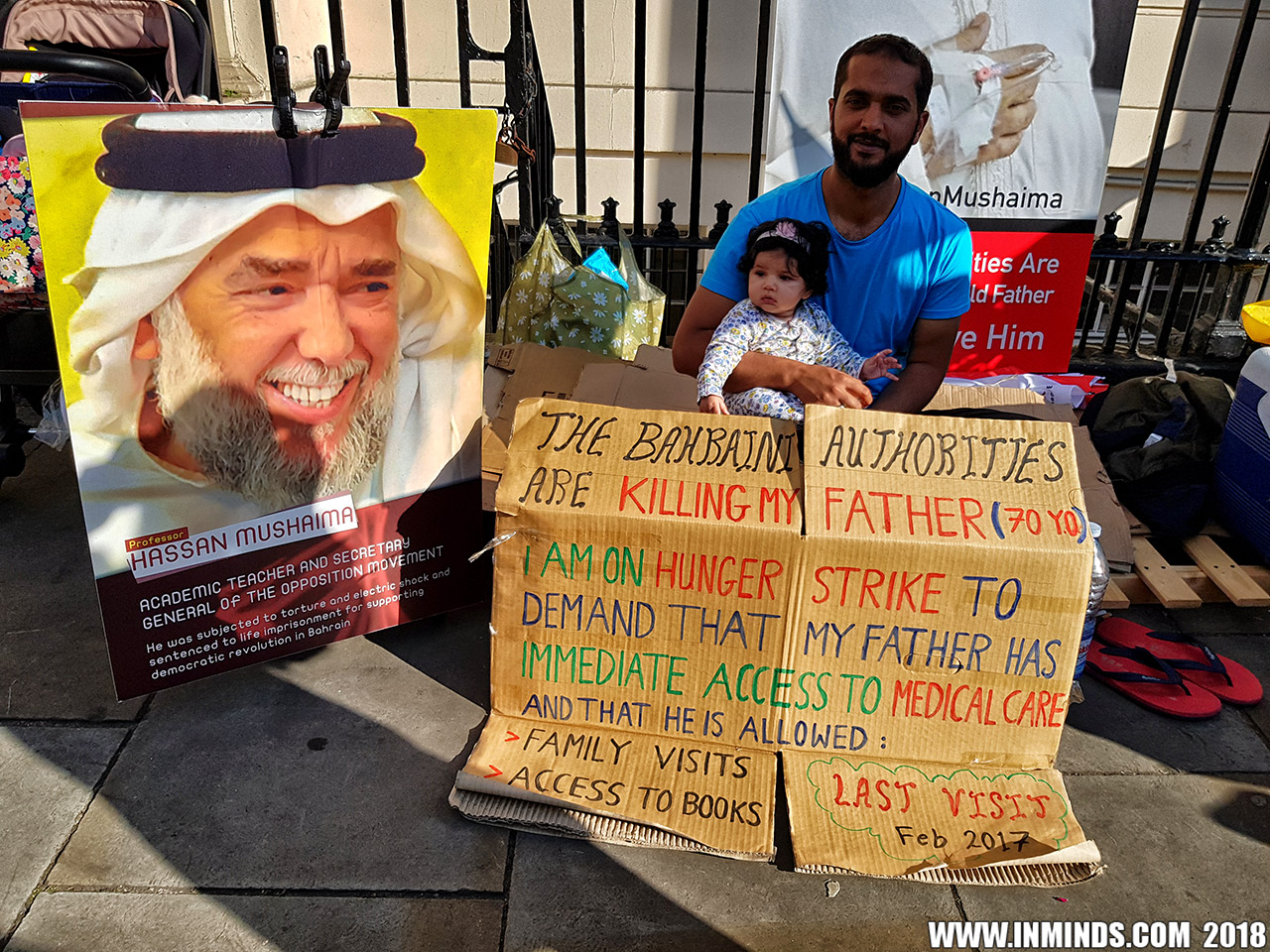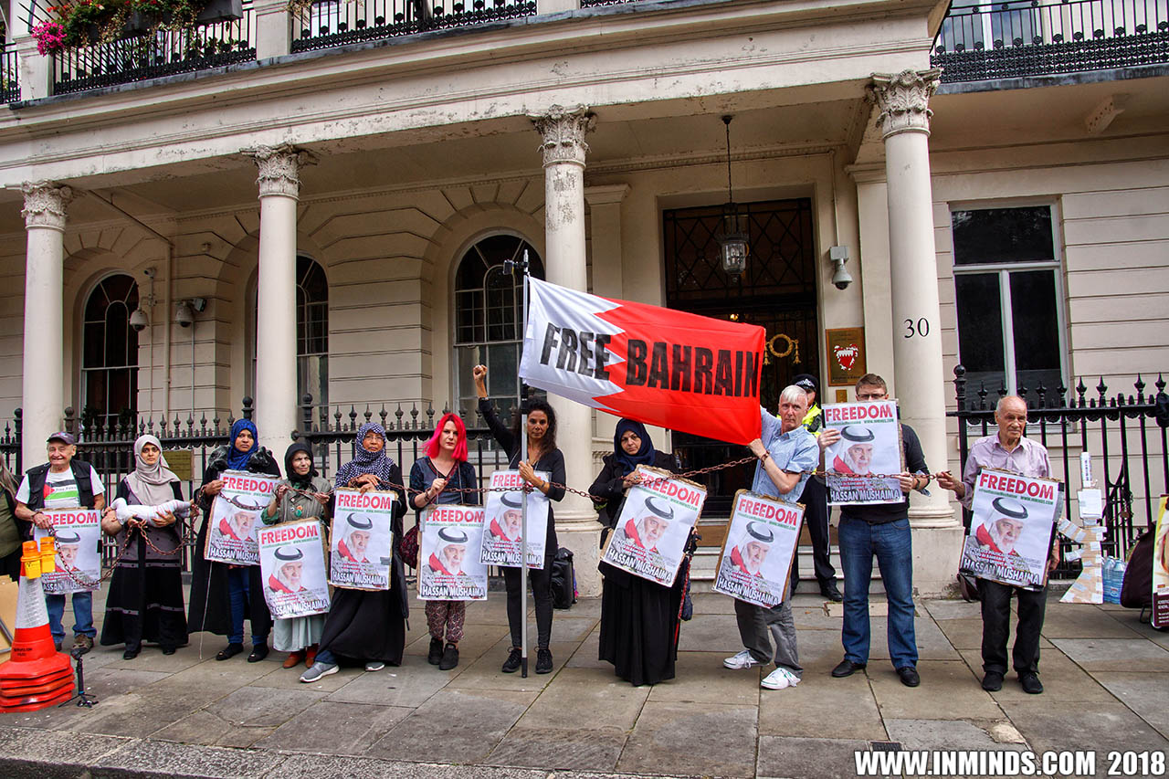 Following an attack by the Bahraini embassy on hunger striker Ali Mushaima in the early hours of Sunday 12th August 2018, Inminds human rights group held a second vigil on Monday 13th August 2018, outside the Bahraini Embassy in London, to demand the MET police arrest the guilty criminals hiding in the Bahraini embassy. The vigil was in solidarity with Ali Mushaima's hunger strike to save his father, prisoner on conscience, Hassan Mushaima's life. Inminds demanded the unconditional release of Hassan Mushaima and all the other 5000 Bahraini prisoners of conscience languishing in the Al-Khalifa regimes dungeons. The vigil also demand the British government end its complicity in the Al Khalifa dictatorship's crimes against the Bahraini people.