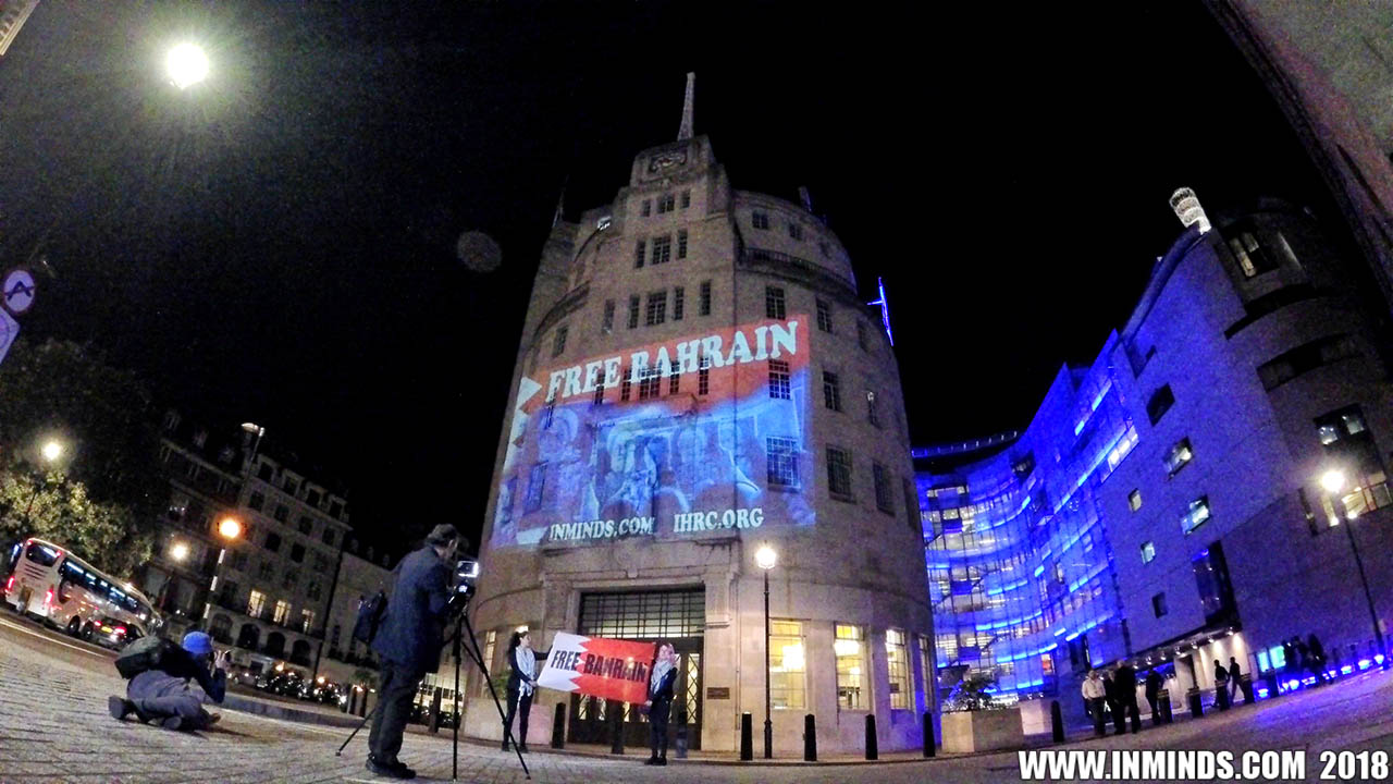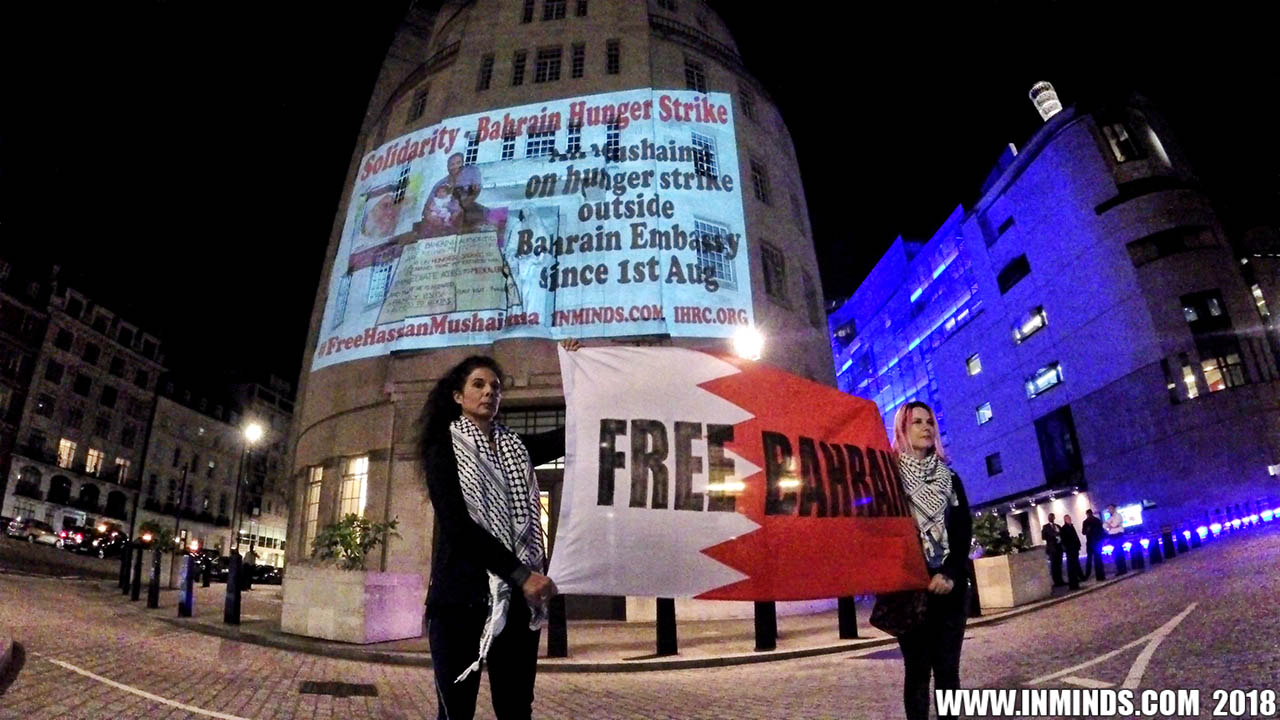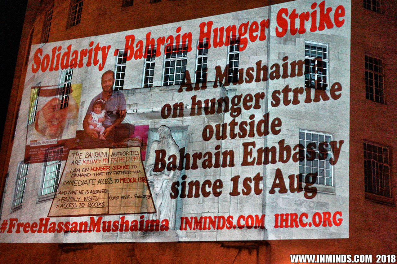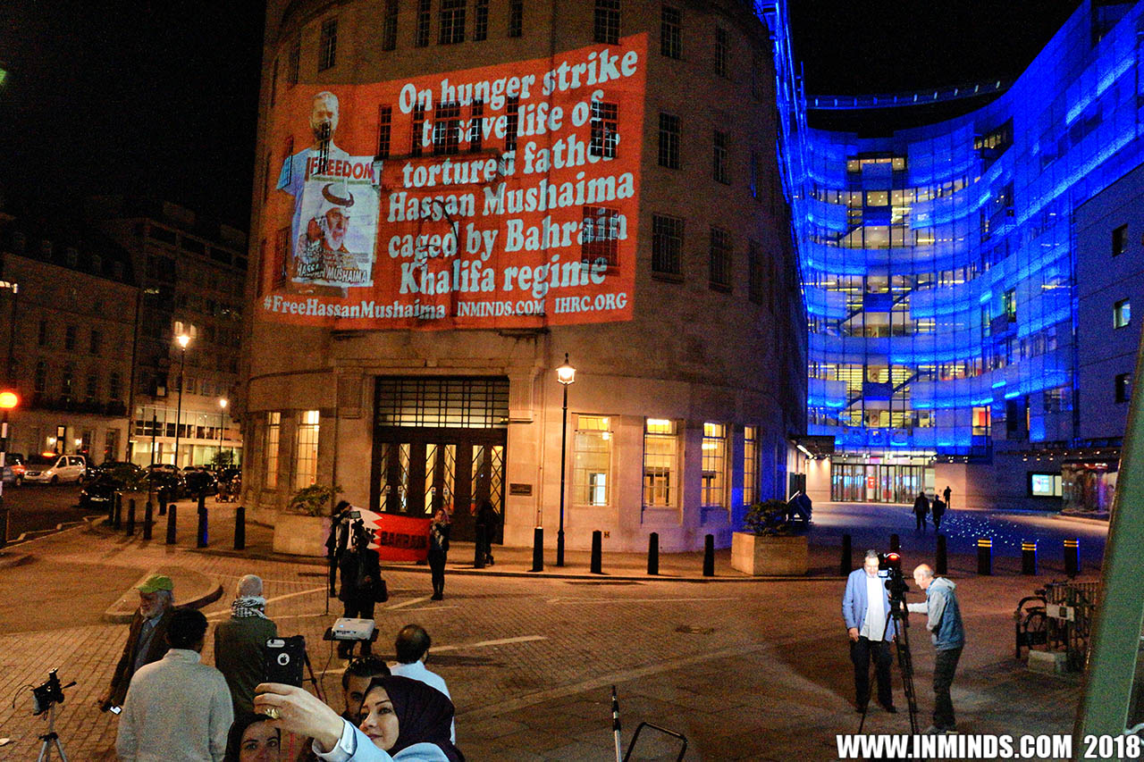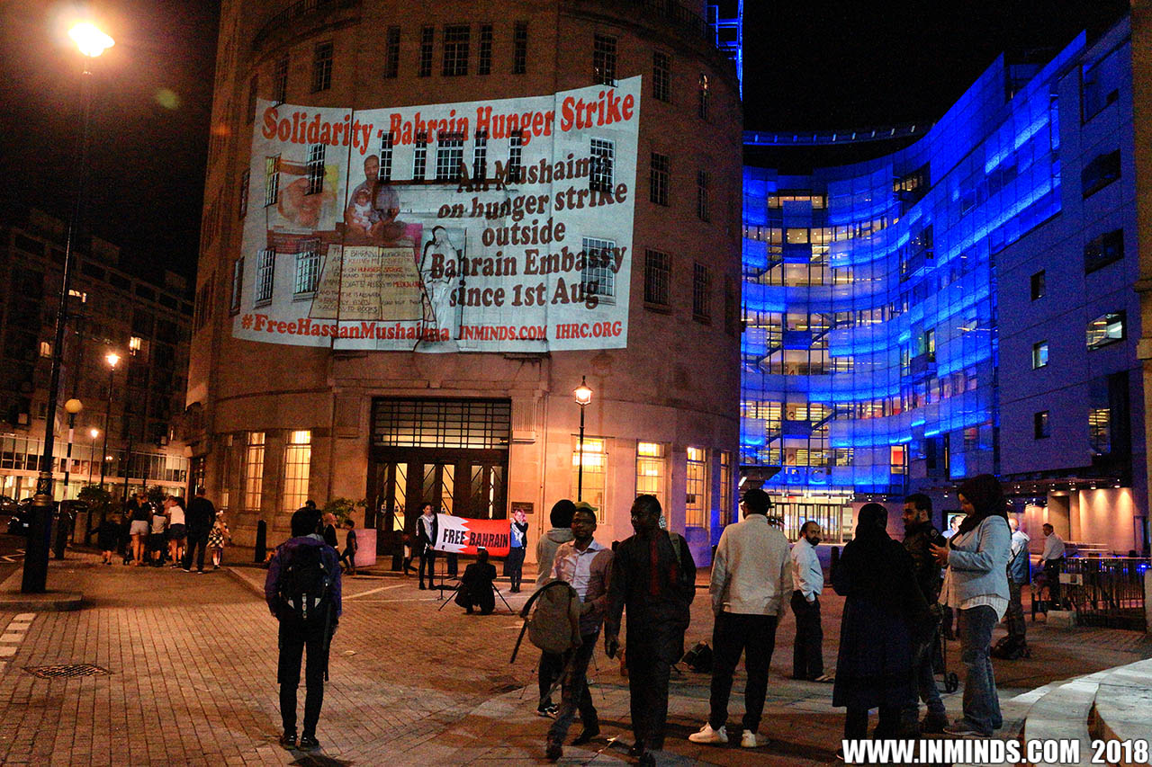 On Saturday 1st September 2018 Inminds human rights group along with the Islamic Human Rights Commission carried out a guerilla projection on the walls of the BBC headquarters in London to ask the BBC why it is not reporting on the systematic human rights abuses by the Khalifa regime in Bahrain, and in particular why it is ignoring the hunger strike of Bahraini activist Ali Mushaima who had to be rushed to hospital on Thursday after a month without food, camped outside the Bahrain Embassy 24 hours a day 7 days week.