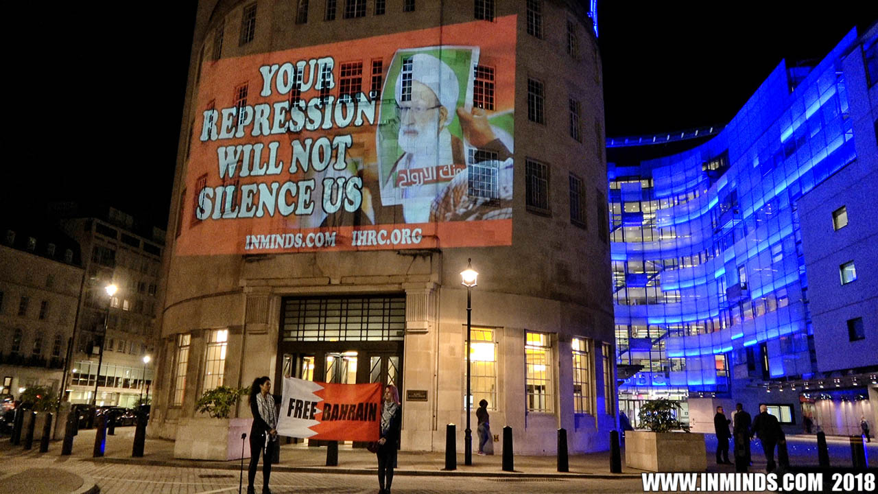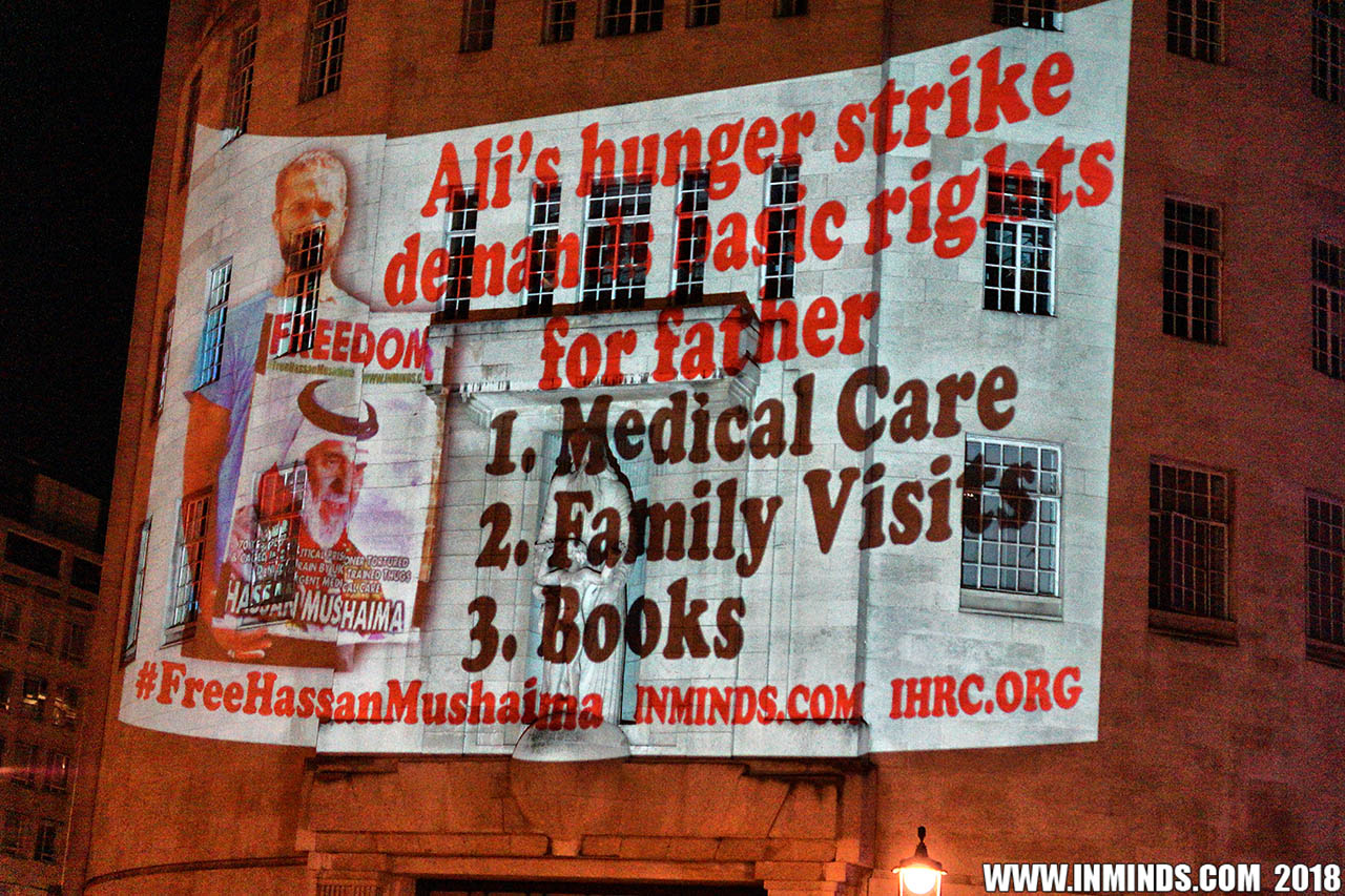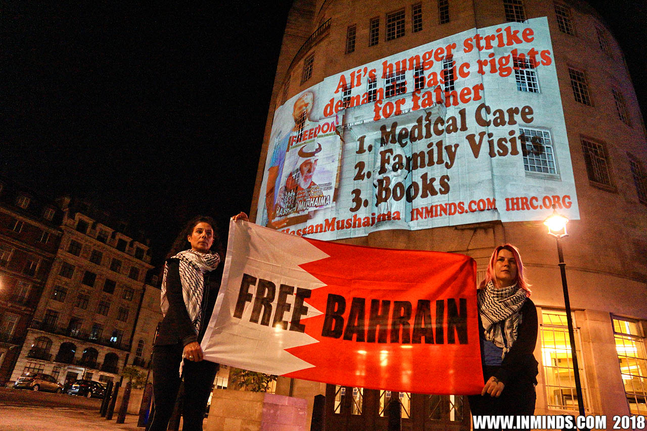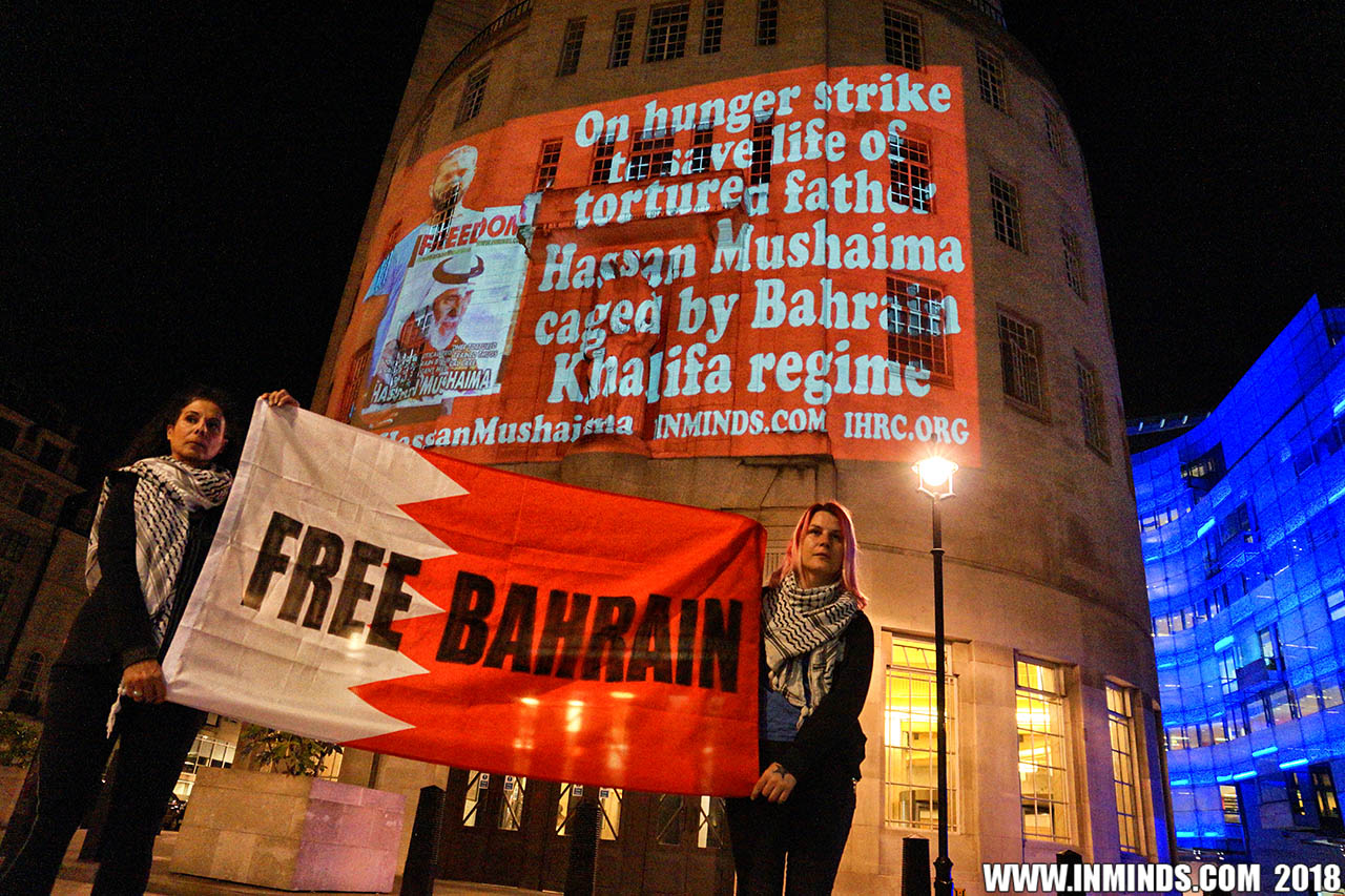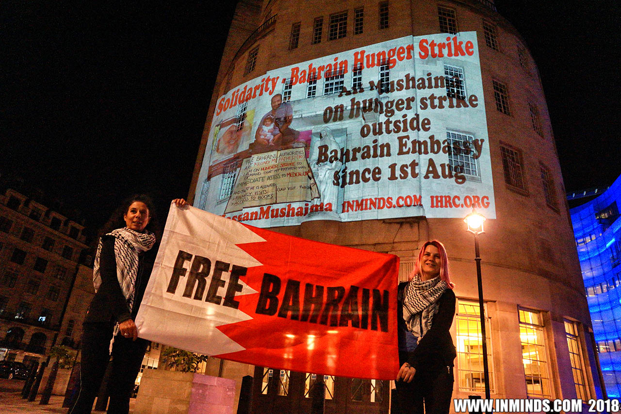 On Saturday 1st September 2018 Inminds human rights group along with the Islamic Human Rights Commission carried out a guerilla projection on the walls of the BBC headquarters in London to ask the BBC why it is not reporting on the systematic human rights abuses by the Khalifa regime in Bahrain, and in particular why it is ignoring the hunger strike of Bahraini activist Ali Mushaima who had to be rushed to hospital on Thursday after a month without food, camped outside the Bahrain Embassy 24 hours a day 7 days week.