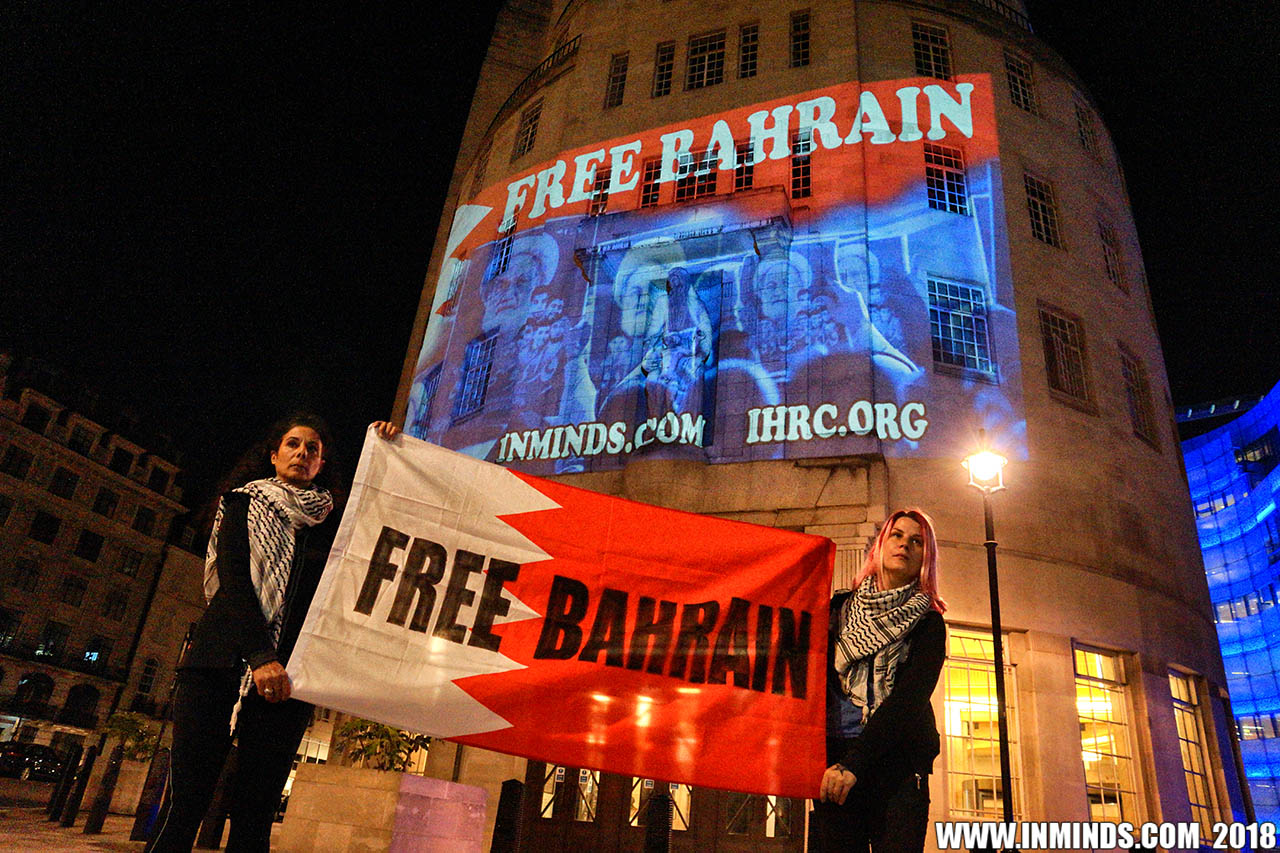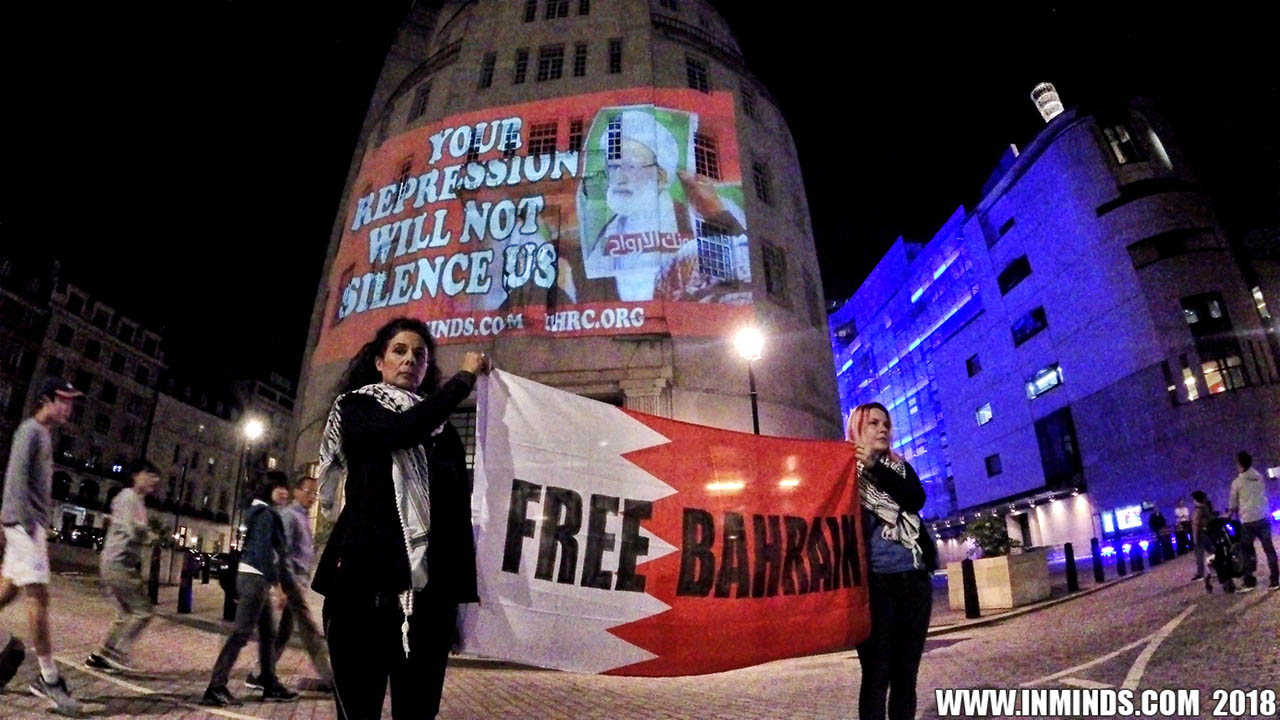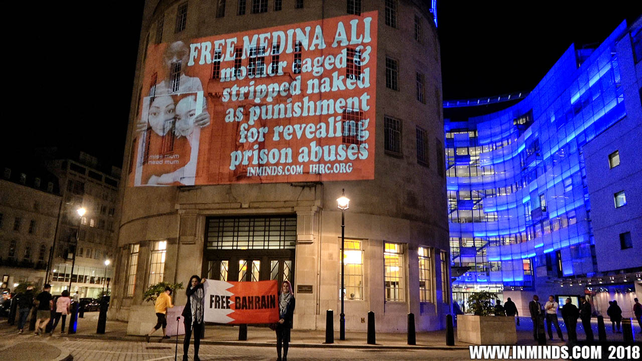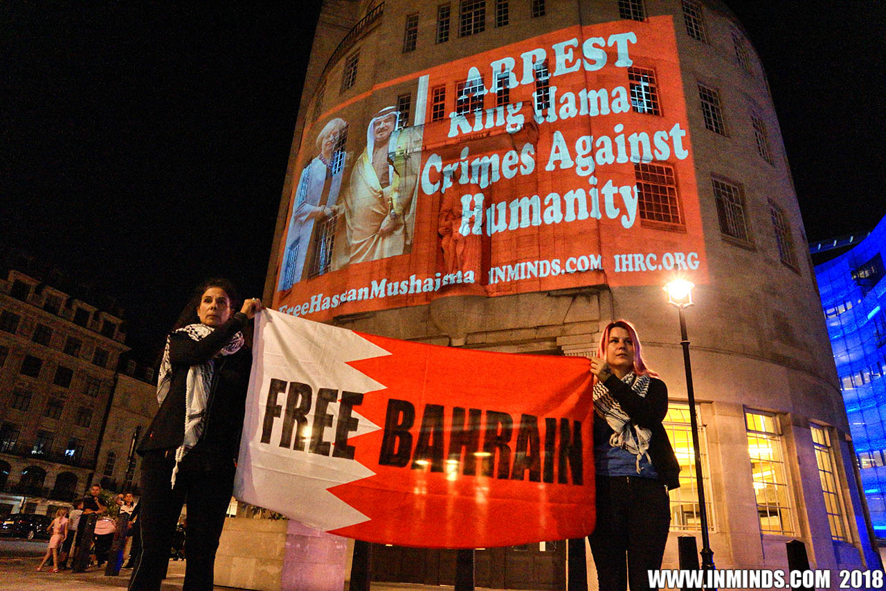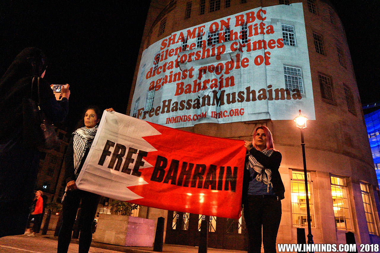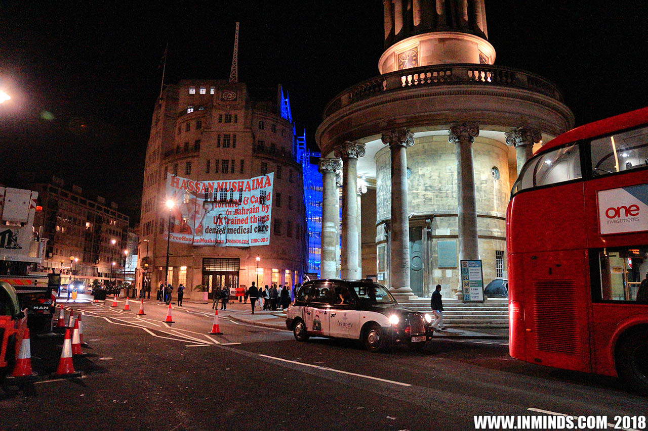 On Saturday 1st September 2018 Inminds human rights group along with the Islamic Human Rights Commission carried out a guerilla projection on the walls of the BBC headquarters in London to ask the BBC why it is not reporting on the systematic human rights abuses by the Khalifa regime in Bahrain, and in particular why it is ignoring the hunger strike of Bahraini activist Ali Mushaima who had to be rushed to hospital on Thursday after a month without food, camped outside the Bahrain Embassy 24 hours a day 7 days week.