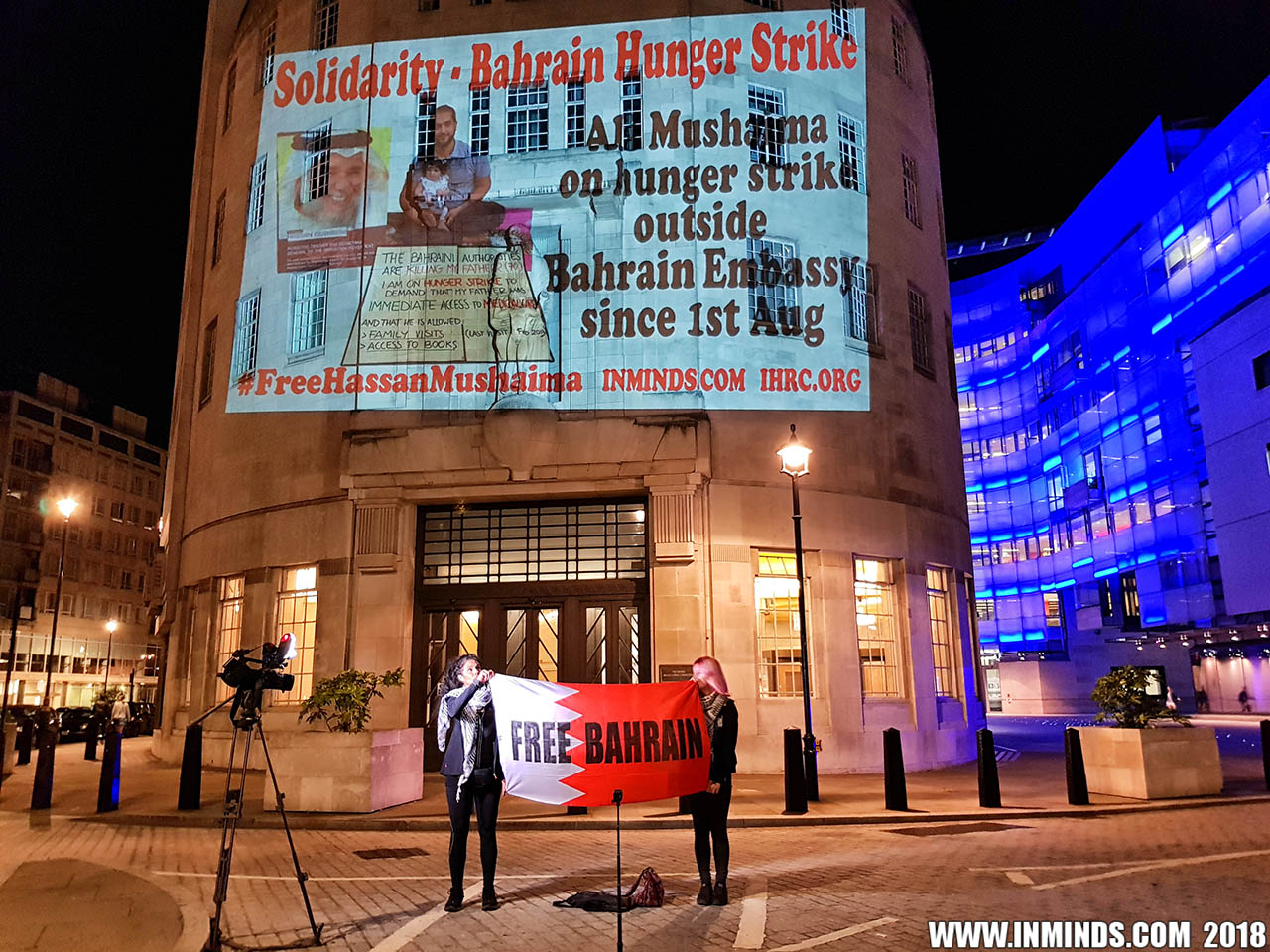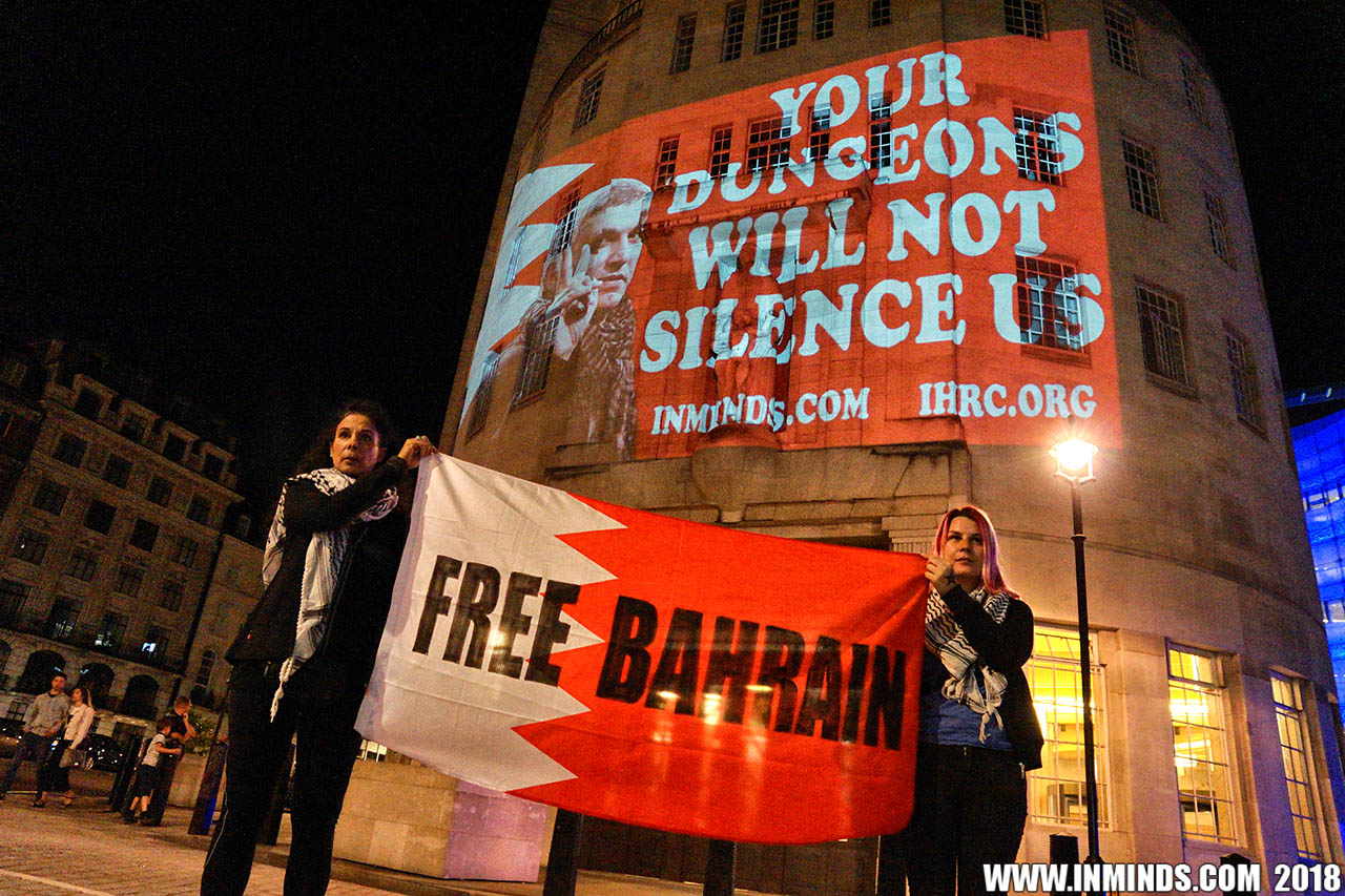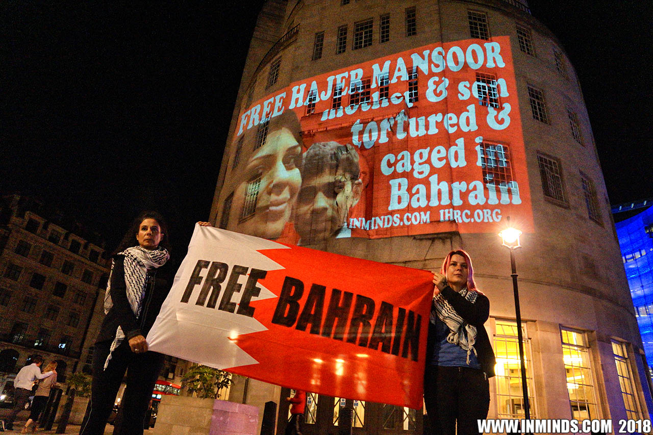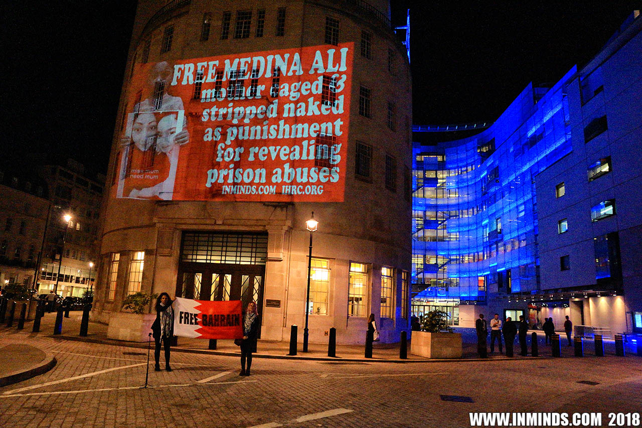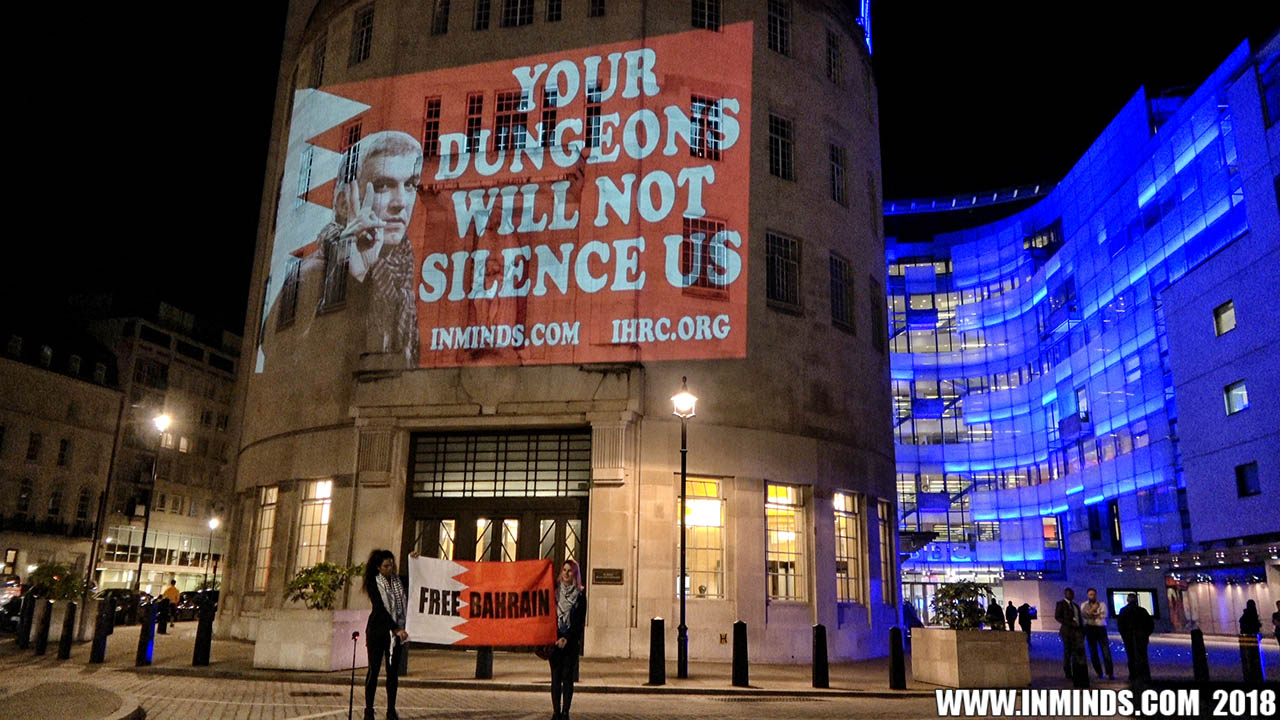 On Saturday 1st September 2018 Inminds human rights group along with the Islamic Human Rights Commission carried out a guerilla projection on the walls of the BBC headquarters in London to ask the BBC why it is not reporting on the systematic human rights abuses by the Khalifa regime in Bahrain, and in particular why it is ignoring the hunger strike of Bahraini activist Ali Mushaima who had to be rushed to hospital on Thursday after a month without food, camped outside the Bahrain Embassy 24 hours a day 7 days week.