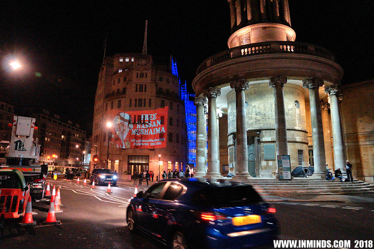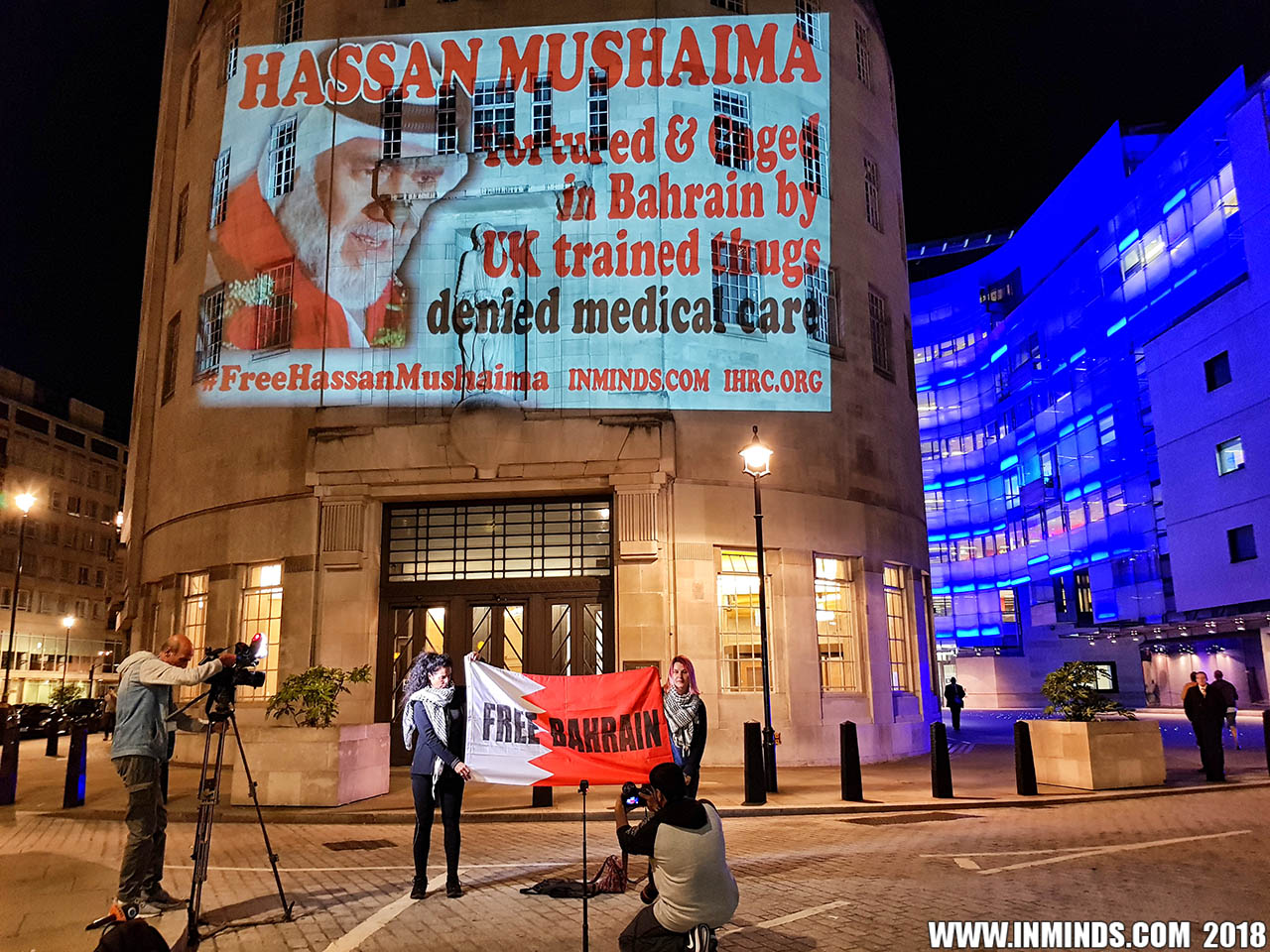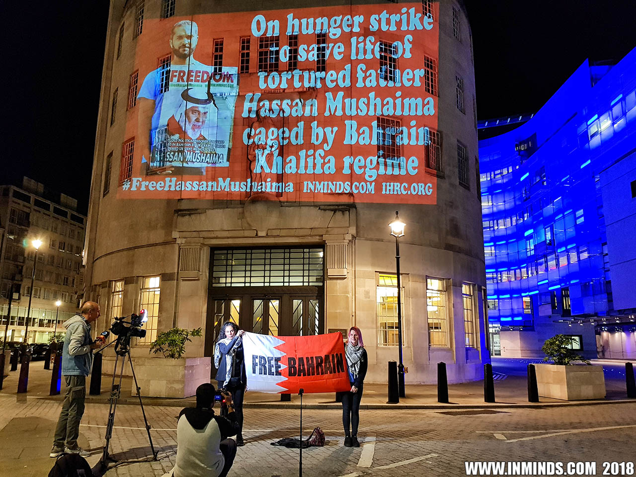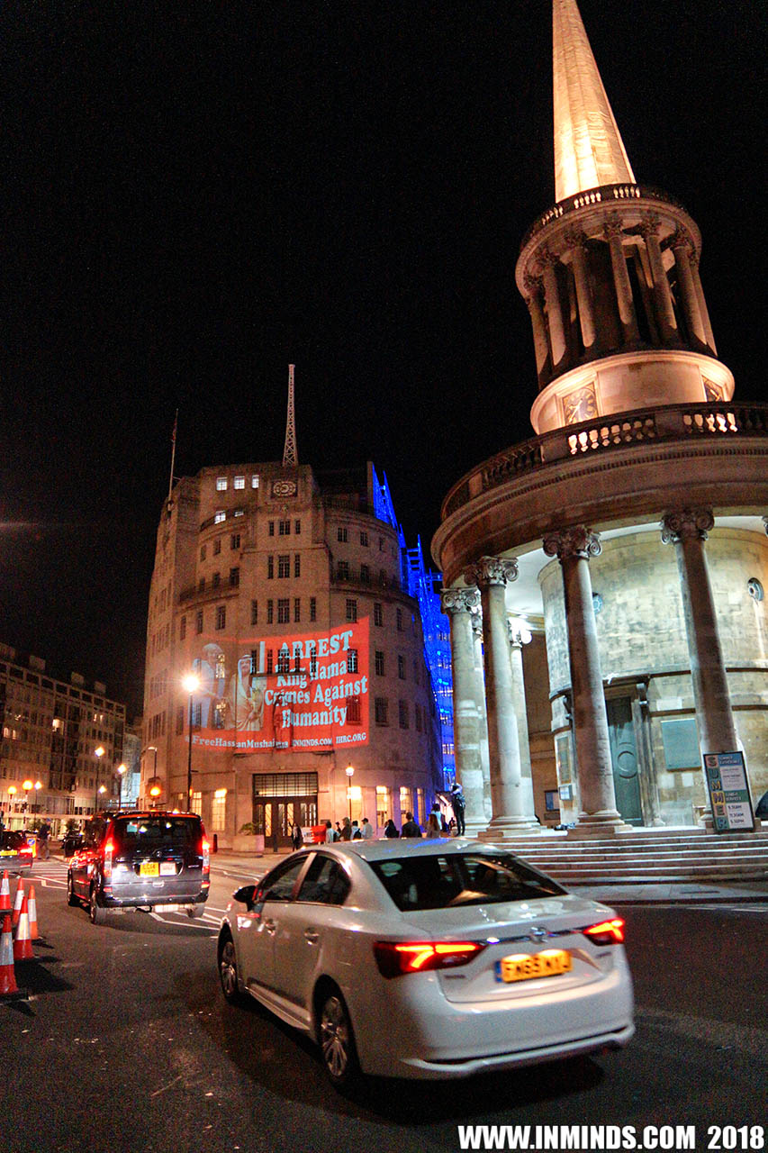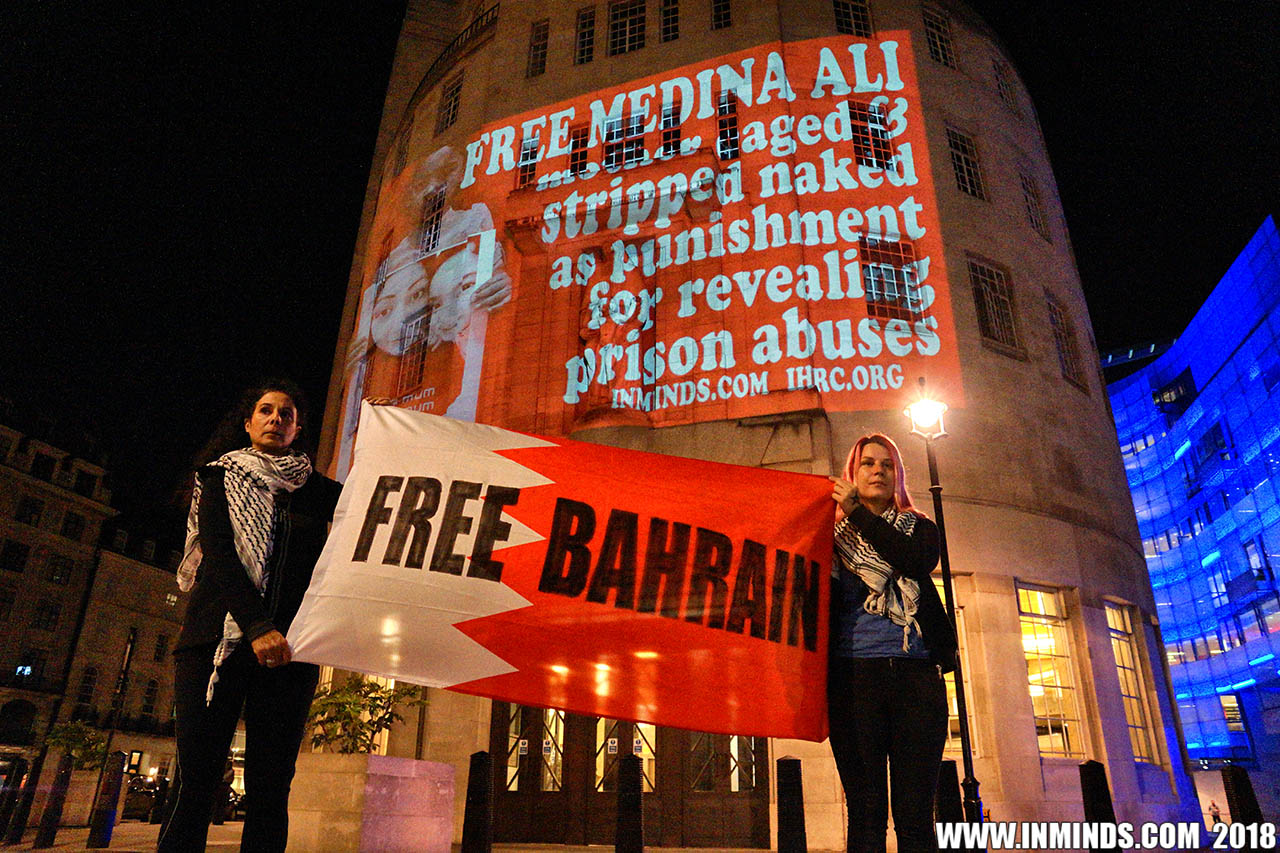 On Saturday 1st September 2018 Inminds human rights group along with the Islamic Human Rights Commission carried out a guerilla projection on the walls of the BBC headquarters in London to ask the BBC why it is not reporting on the systematic human rights abuses by the Khalifa regime in Bahrain, and in particular why it is ignoring the hunger strike of Bahraini activist Ali Mushaima who had to be rushed to hospital on Thursday after a month without food, camped outside the Bahrain Embassy 24 hours a day 7 days week.