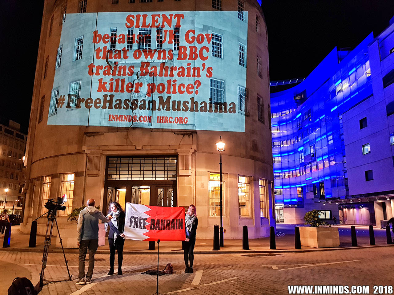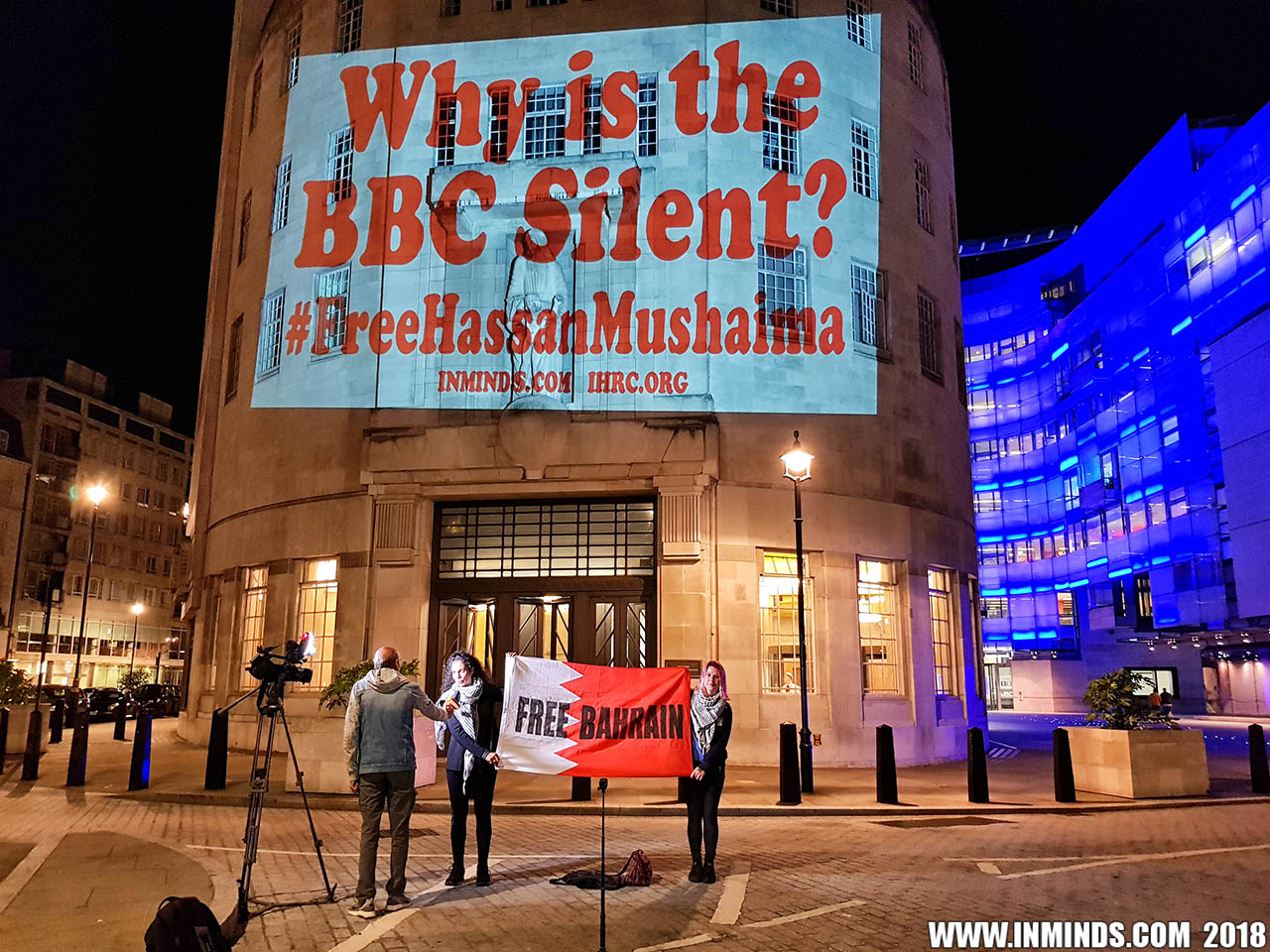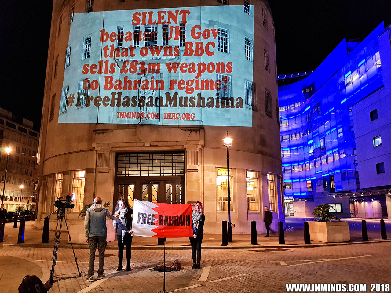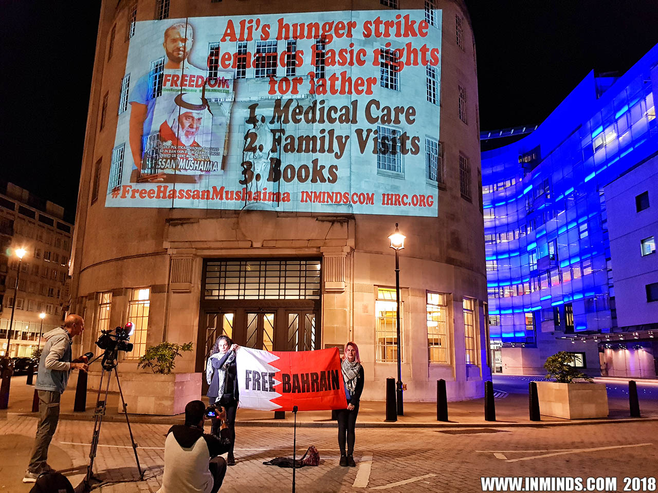 On Saturday 1st September 2018 Inminds human rights group along with the Islamic Human Rights Commission carried out a guerilla projection on the walls of the BBC headquarters in London to ask the BBC why it is not reporting on the systematic human rights abuses by the Khalifa regime in Bahrain, and in particular why it is ignoring the hunger strike of Bahraini activist Ali Mushaima who had to be rushed to hospital on Thursday after a month without food, camped outside the Bahrain Embassy 24 hours a day 7 days week.