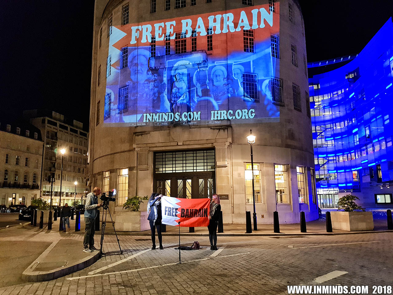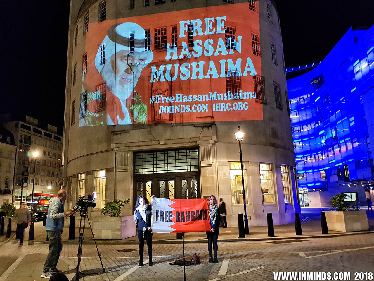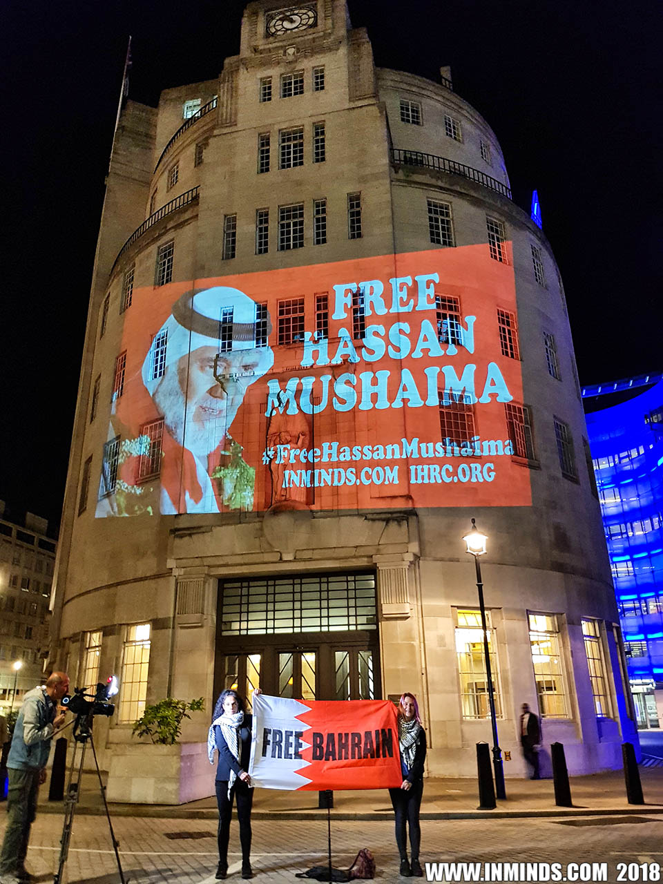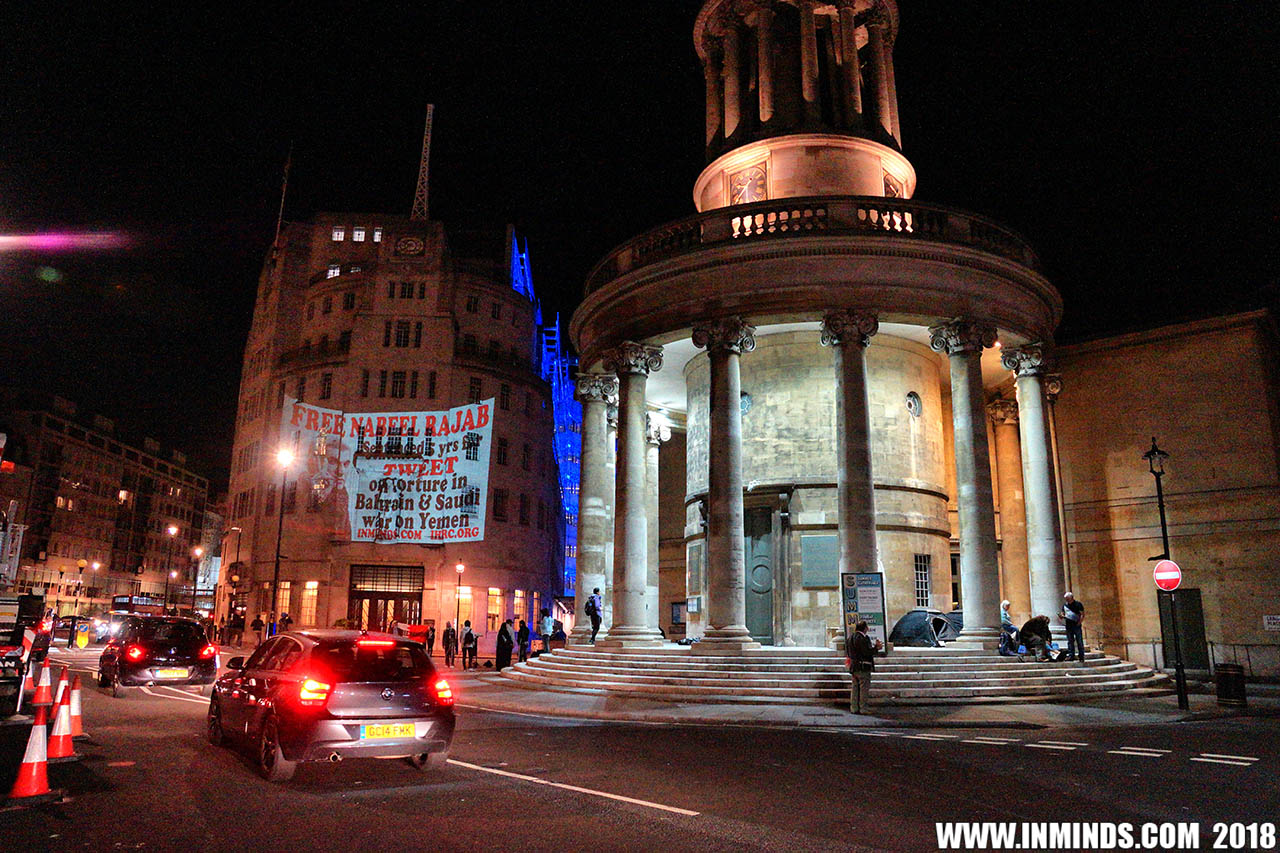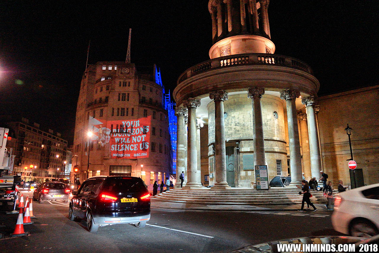 On Saturday 1st September 2018 Inminds human rights group along with the Islamic Human Rights Commission carried out a guerilla projection on the walls of the BBC headquarters in London to ask the BBC why it is not reporting on the systematic human rights abuses by the Khalifa regime in Bahrain, and in particular why it is ignoring the hunger strike of Bahraini activist Ali Mushaima who had to be rushed to hospital on Thursday after a month without food, camped outside the Bahrain Embassy 24 hours a day 7 days week.