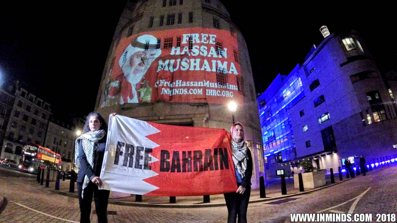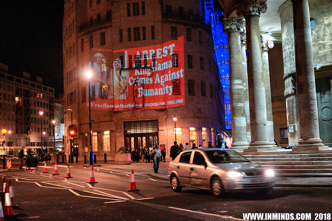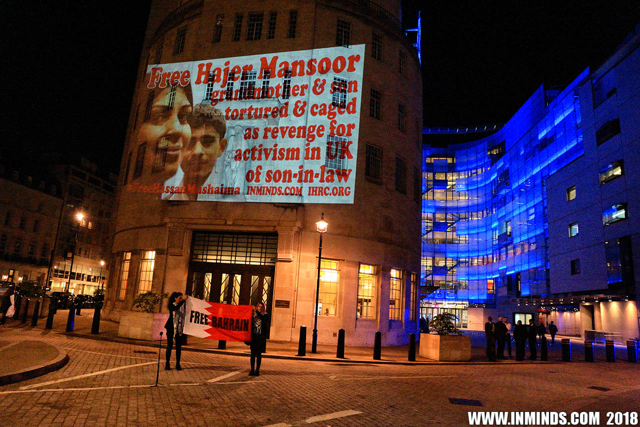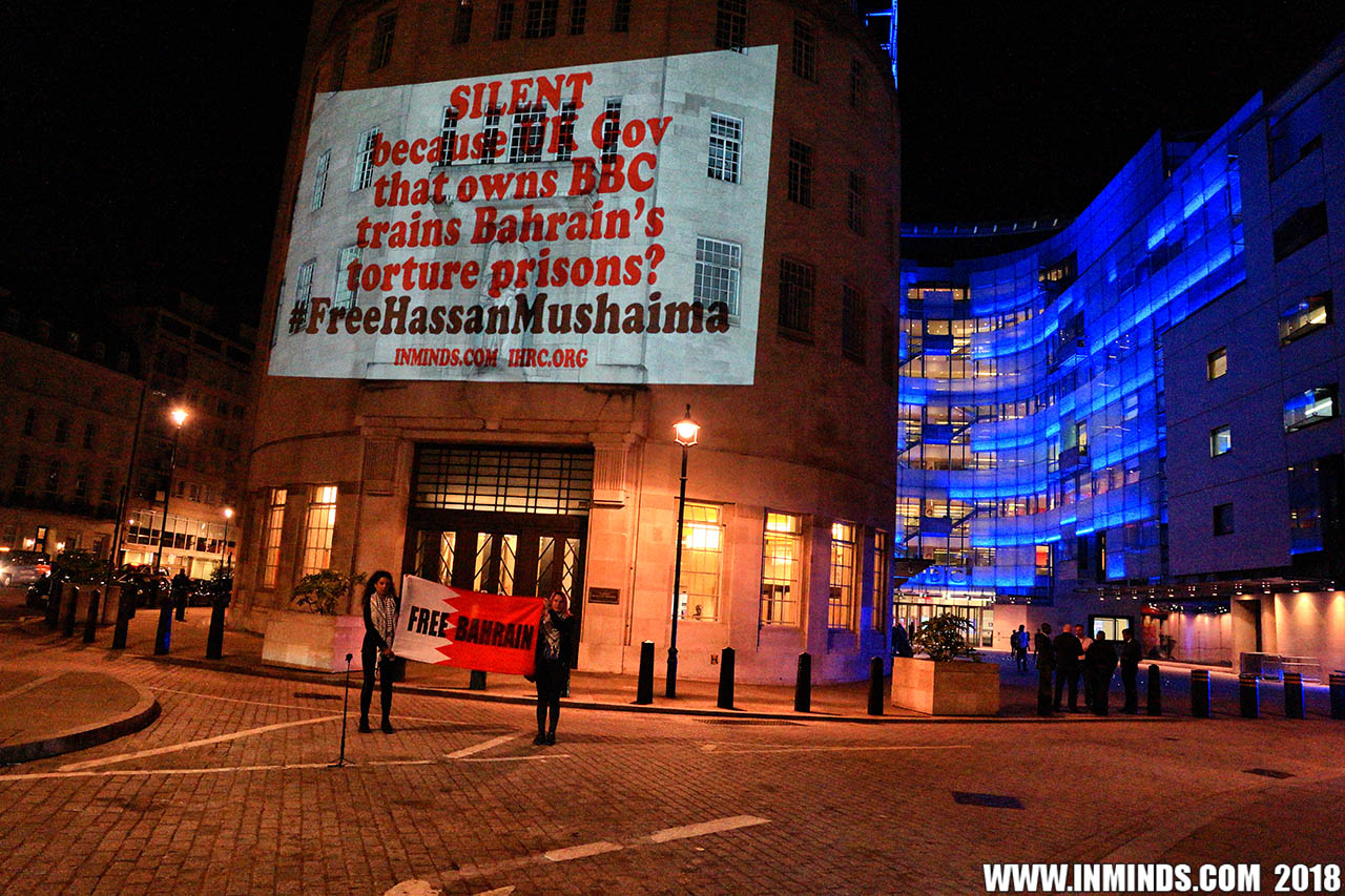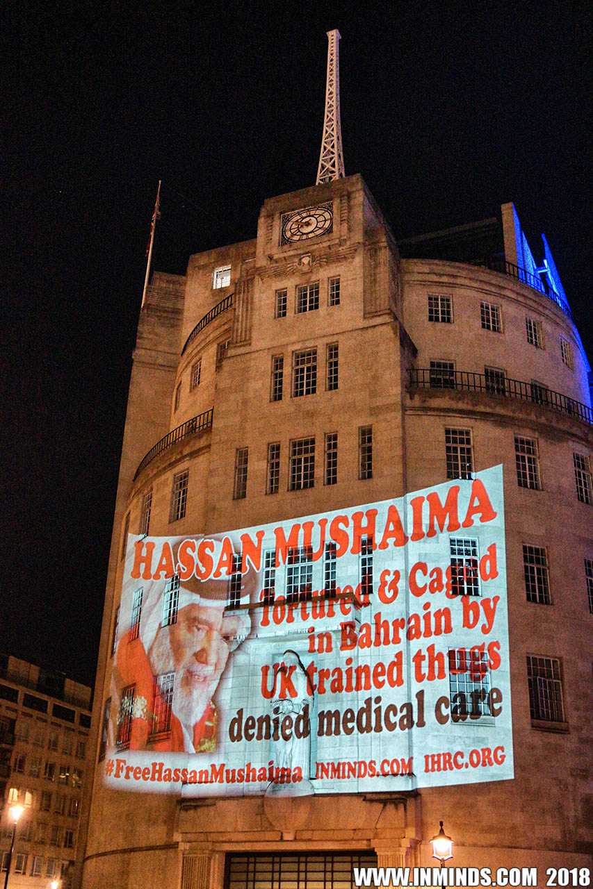 Inminds chair Abbas Ali added "Hassan Mushaima is one of thousands of political prisoners caged in Bahrain since the peoples peaceful uprising, demanding human rights and democracy. Each imprisoned victim of this regime, abducted, tortured and caged by UK trained thugs, has a story of suffering and resistance to tell. All are all ignored by the BBC. So we used the walls of the BBC to shine a light, to show a glimpse of some of their tragic stories. Their stories also feature villains, torturers.. so we also name and shame a few of them."