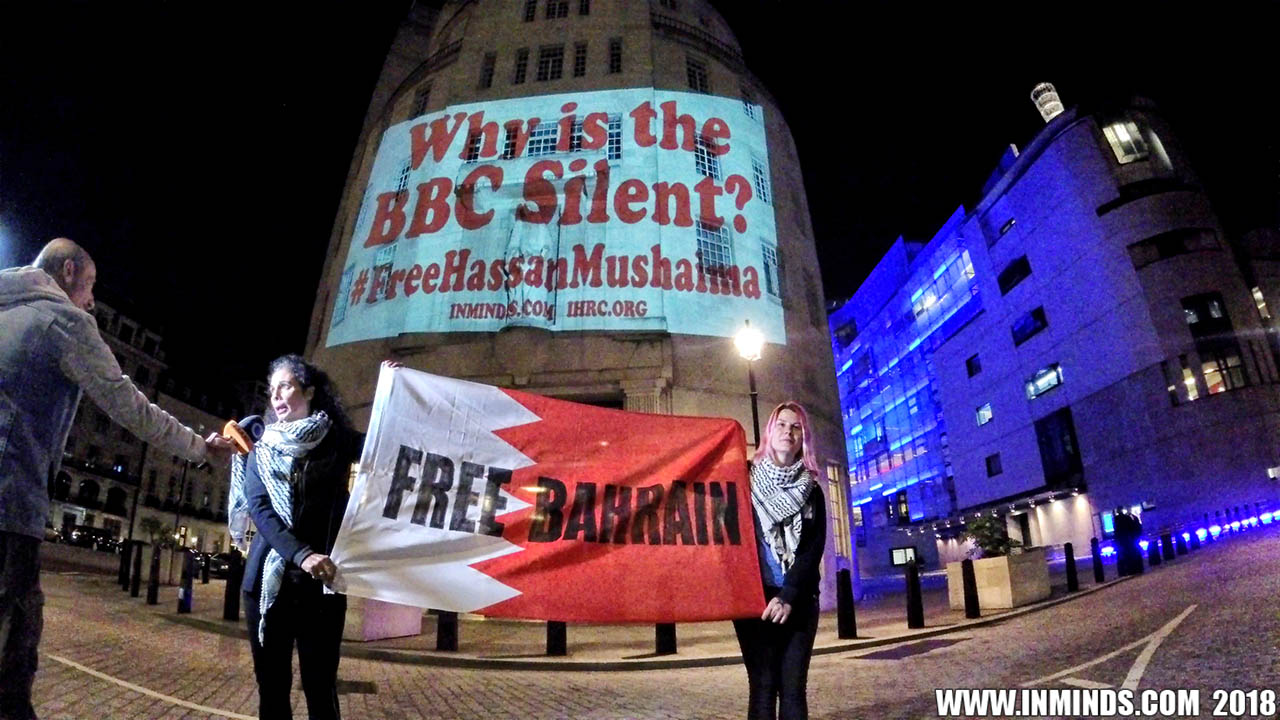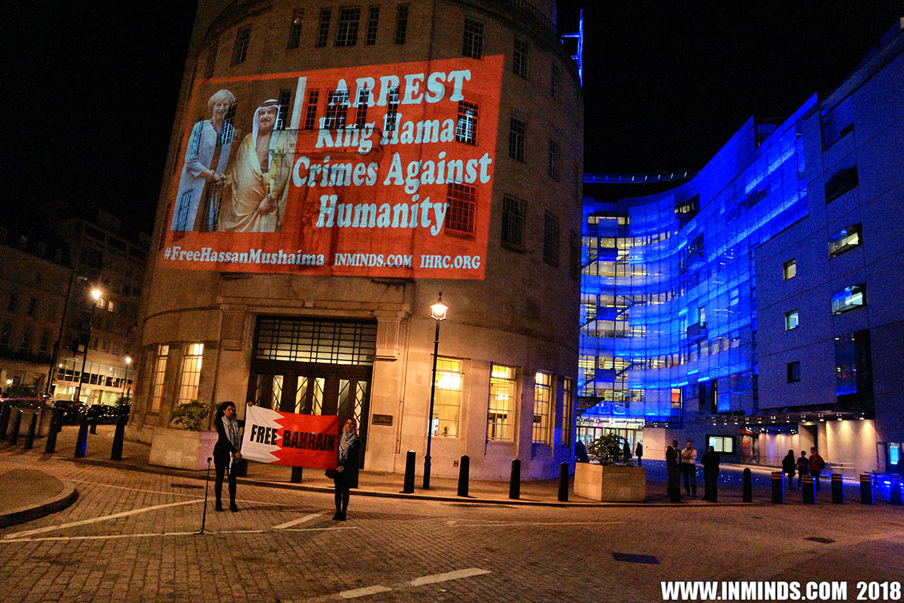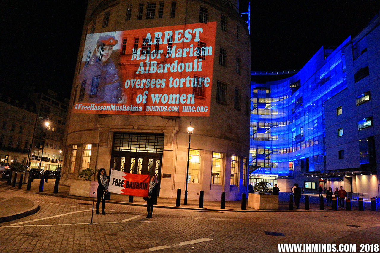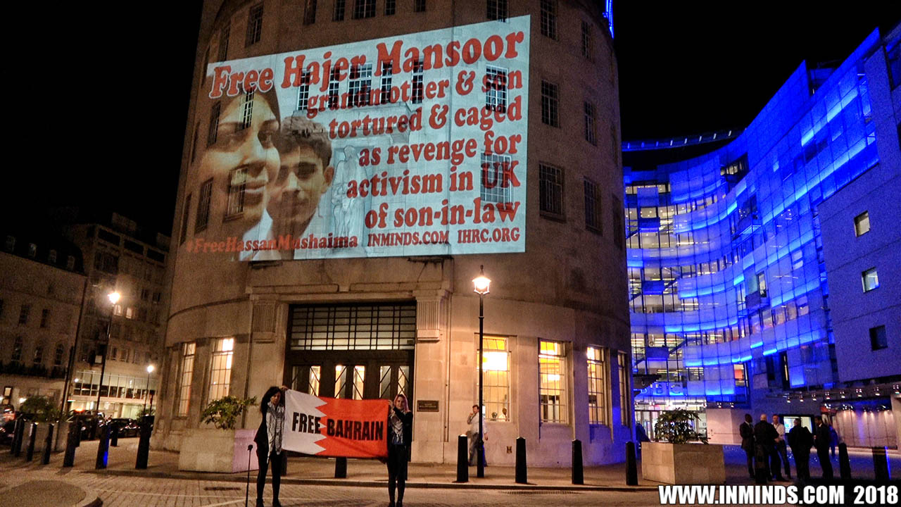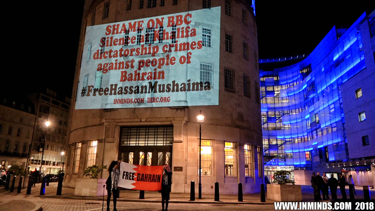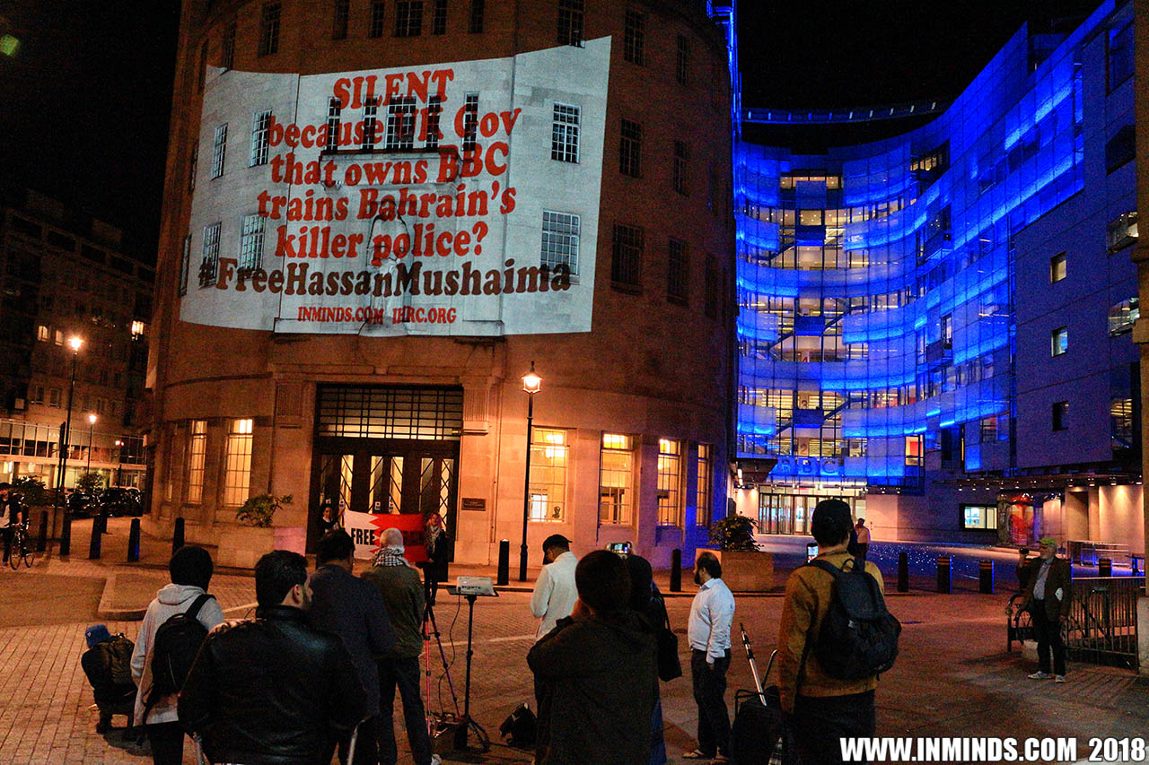 Inminds chair Abbas Ali added "Hassan Mushaima is one of thousands of political prisoners caged in Bahrain since the peoples peaceful uprising, demanding human rights and democracy. Each imprisoned victim of this regime, abducted, tortured and caged by UK trained thugs, has a story of suffering and resistance to tell. All are all ignored by the BBC. So we used the walls of the BBC to shine a light, to show a glimpse of some of their tragic stories. Their stories also feature villains, torturers.. so we also name and shame a few of them."