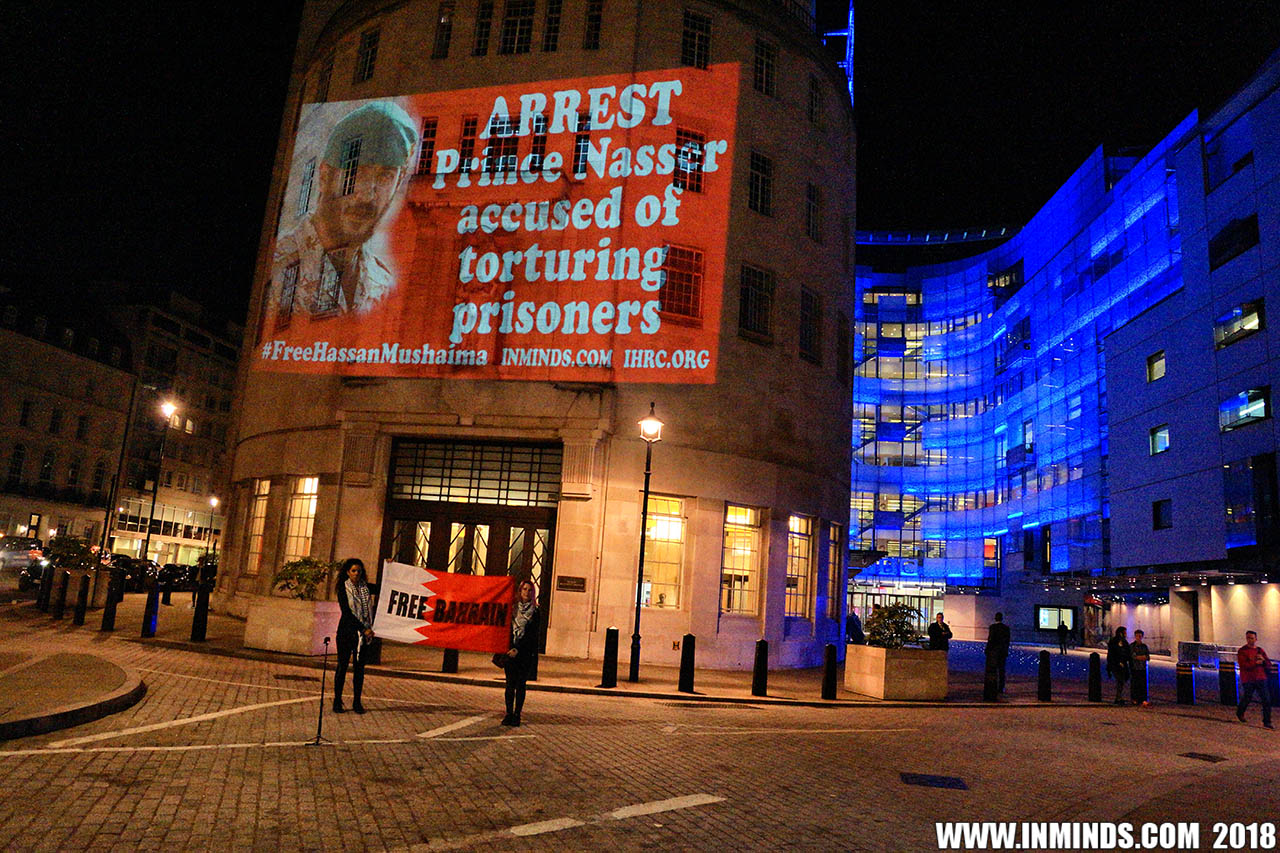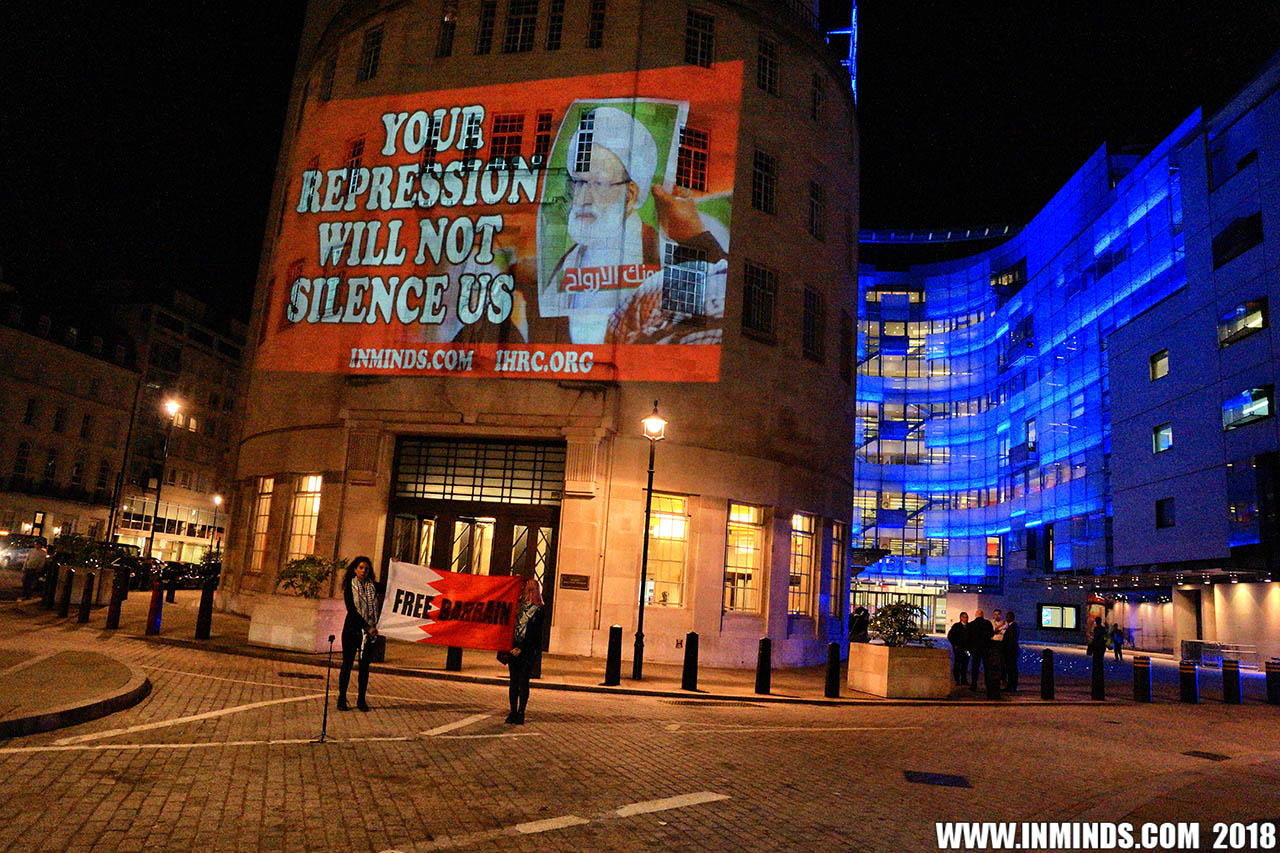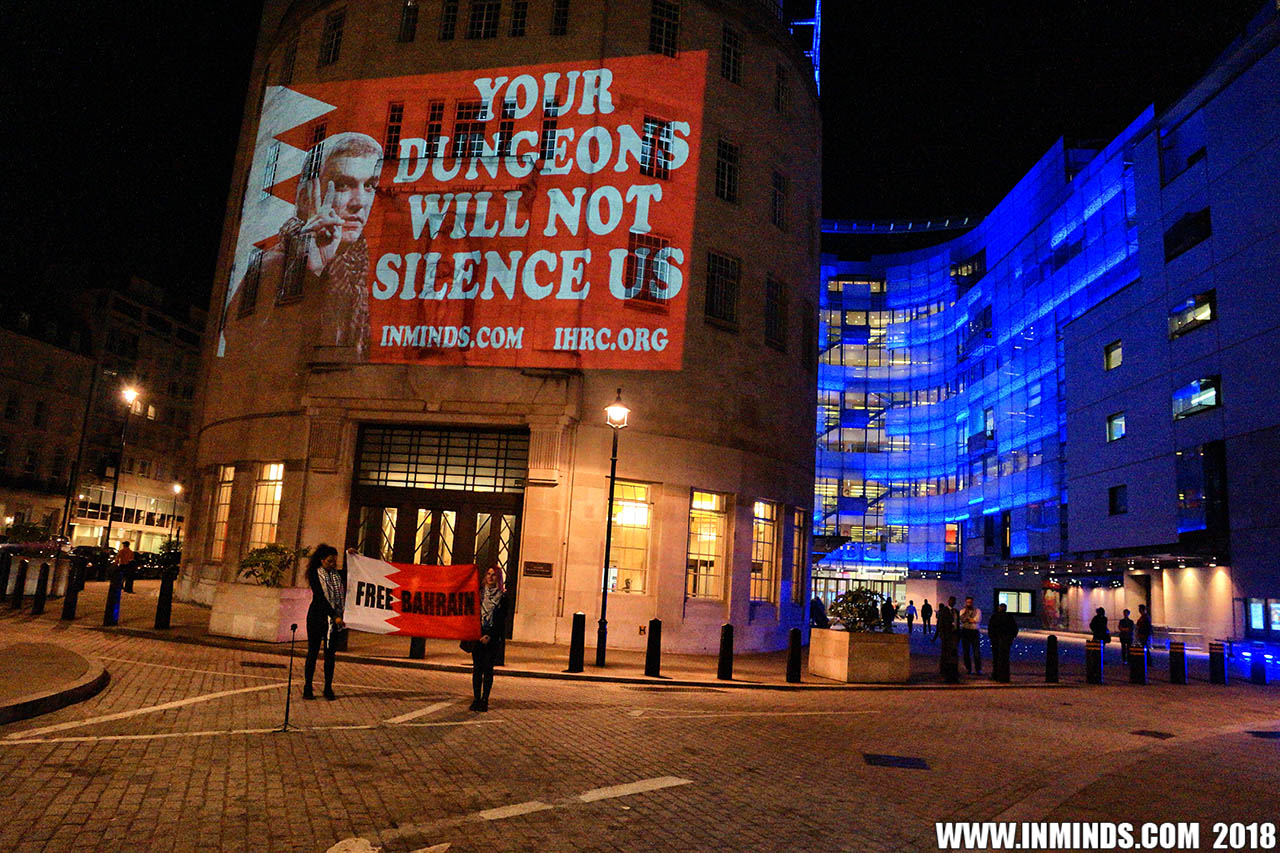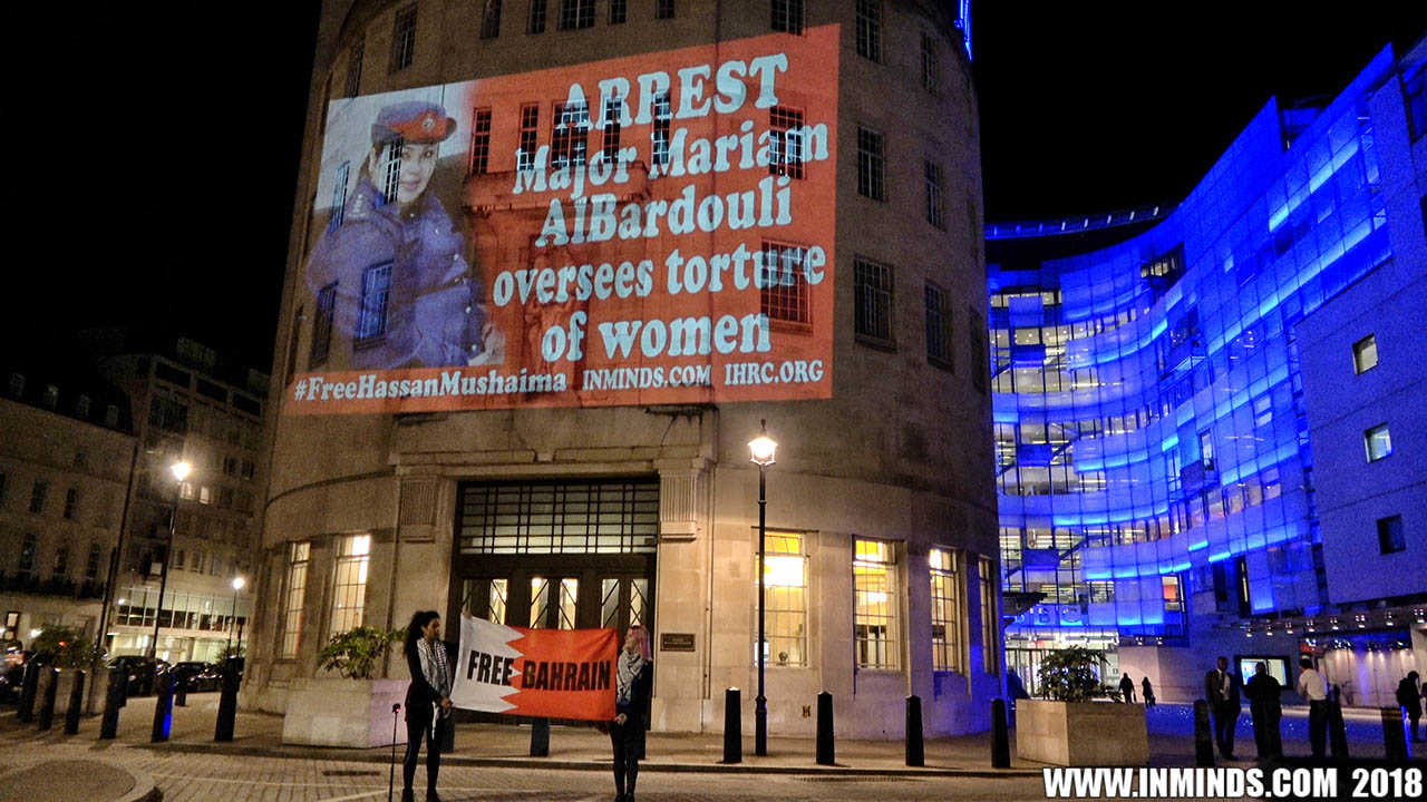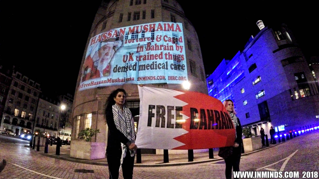 Inminds chair Abbas Ali added "Hassan Mushaima is one of thousands of political prisoners caged in Bahrain since the peoples peaceful uprising, demanding human rights and democracy. Each imprisoned victim of this regime, abducted, tortured and caged by UK trained thugs, has a story of suffering and resistance to tell. All are all ignored by the BBC. So we used the walls of the BBC to shine a light, to show a glimpse of some of their tragic stories. Their stories also feature villains, torturers.. so we also name and shame a few of them."