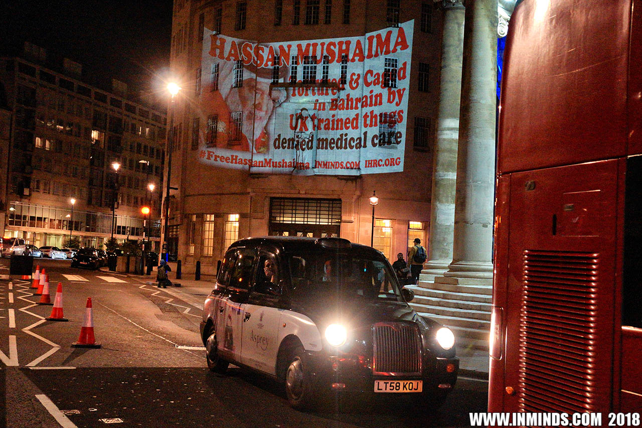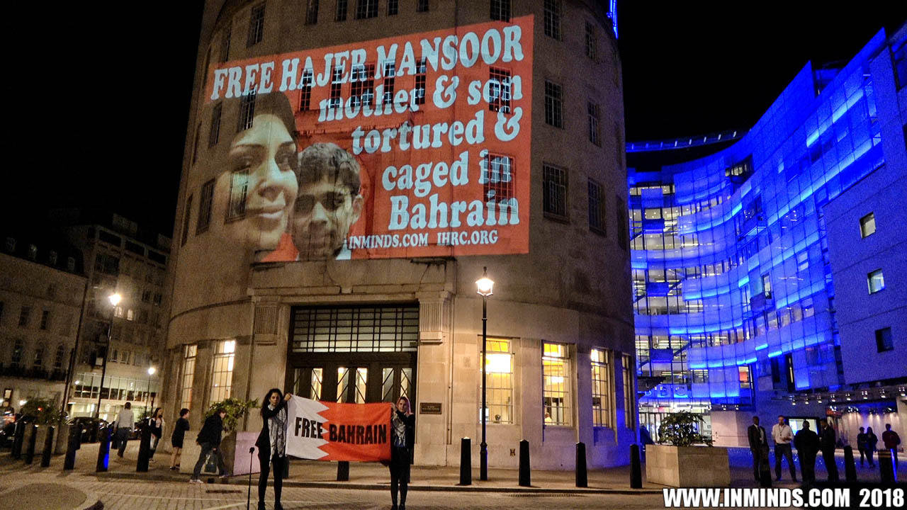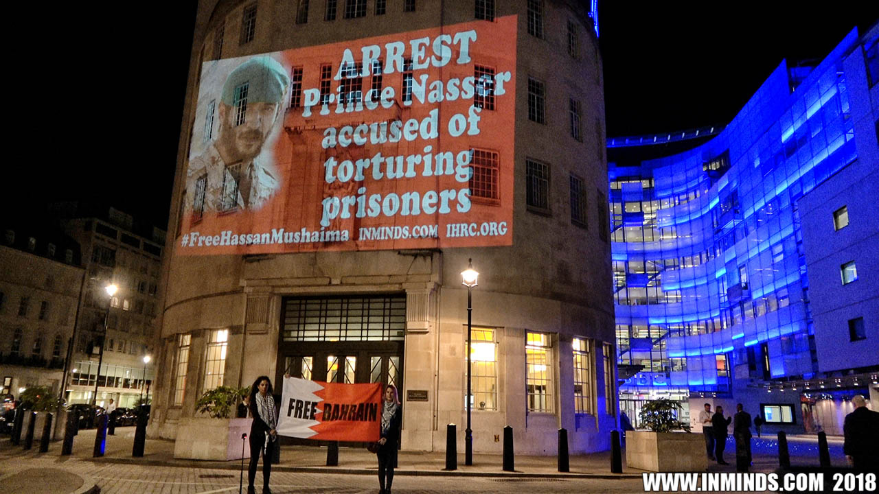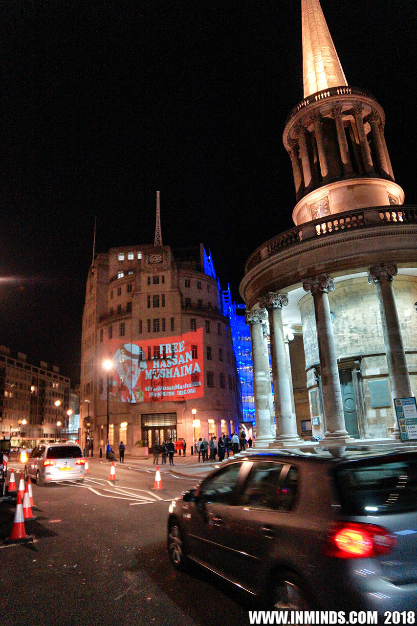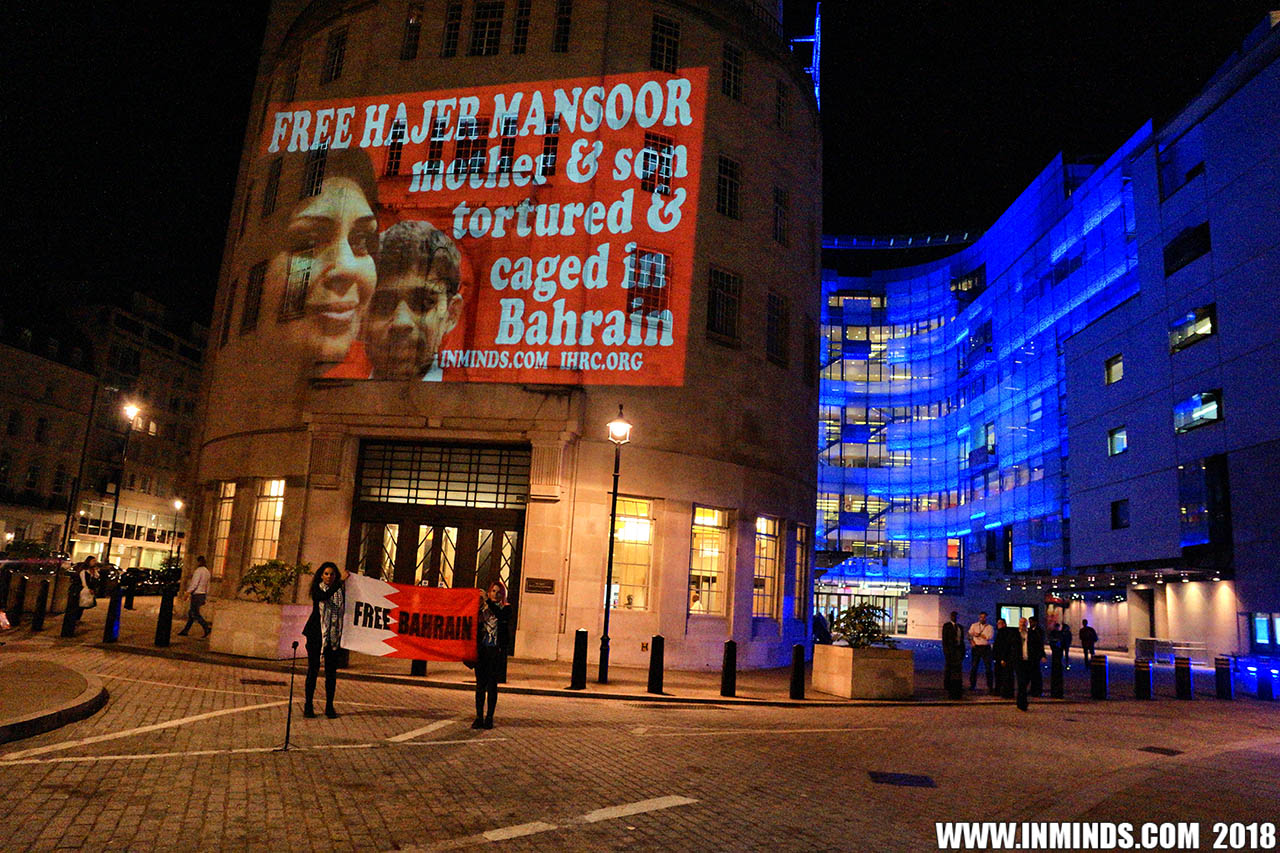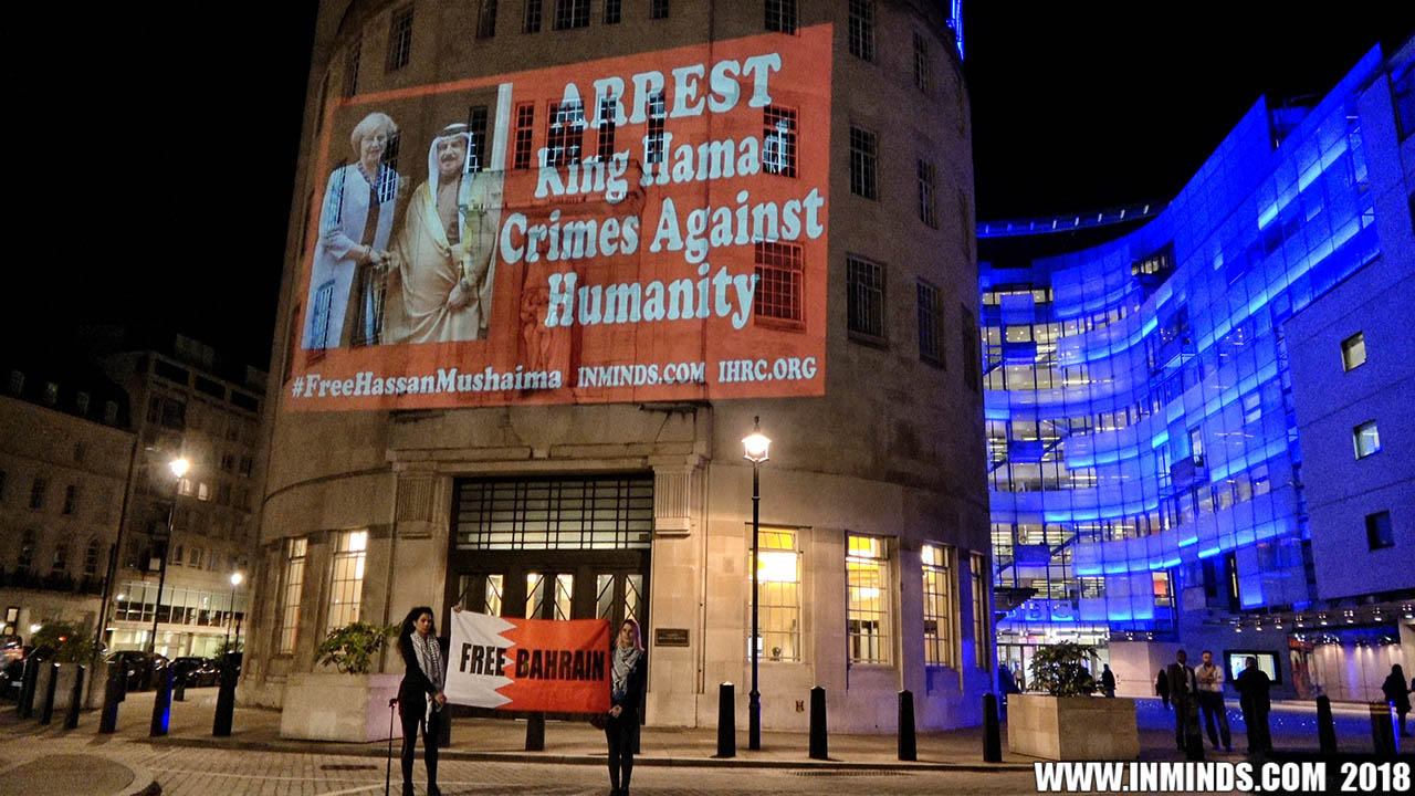 Inminds chair Abbas Ali added "Hassan Mushaima is one of thousands of political prisoners caged in Bahrain since the peoples peaceful uprising, demanding human rights and democracy. Each imprisoned victim of this regime, abducted, tortured and caged by UK trained thugs, has a story of suffering and resistance to tell. All are all ignored by the BBC. So we used the walls of the BBC to shine a light, to show a glimpse of some of their tragic stories. Their stories also feature villains, torturers.. so we also name and shame a few of them."