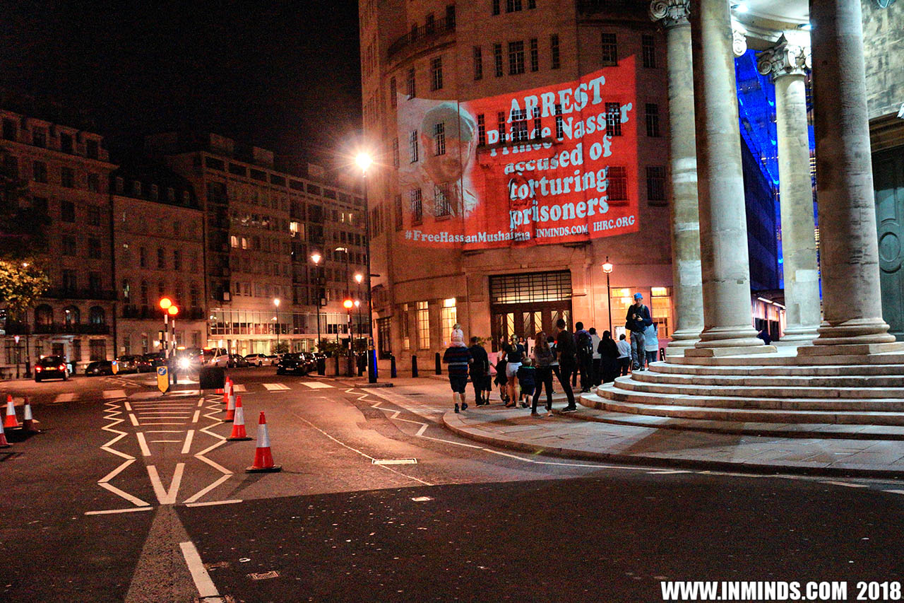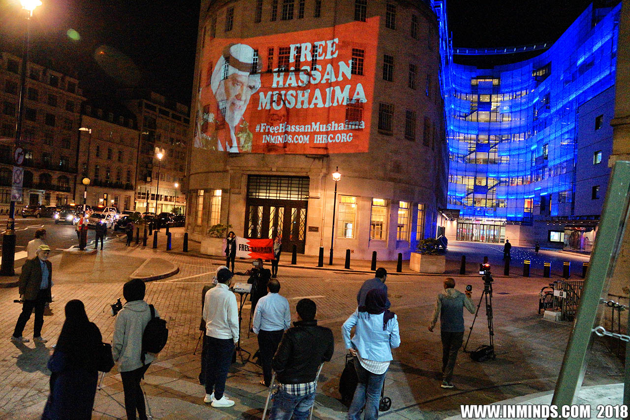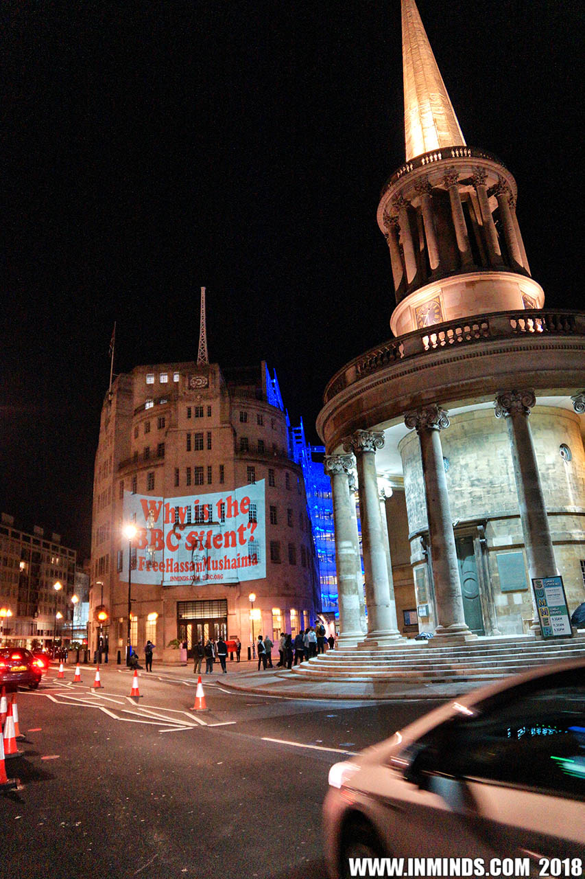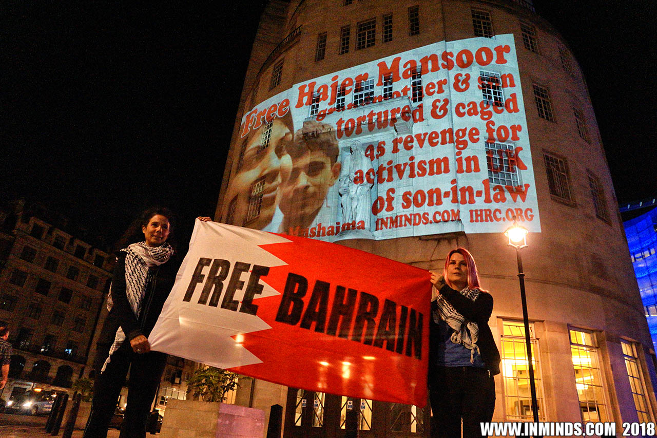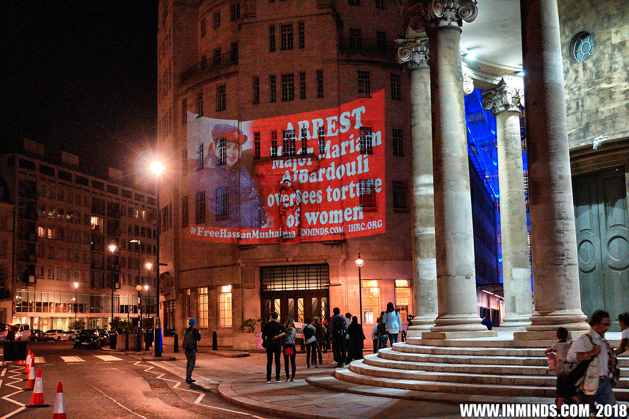 Inminds chair Abbas Ali added "Hassan Mushaima is one of thousands of political prisoners caged in Bahrain since the peoples peaceful uprising, demanding human rights and democracy. Each imprisoned victim of this regime, abducted, tortured and caged by UK trained thugs, has a story of suffering and resistance to tell. All are all ignored by the BBC. So we used the walls of the BBC to shine a light, to show a glimpse of some of their tragic stories. Their stories also feature villains, torturers.. so we also name and shame a few of them."