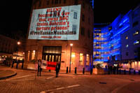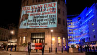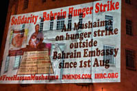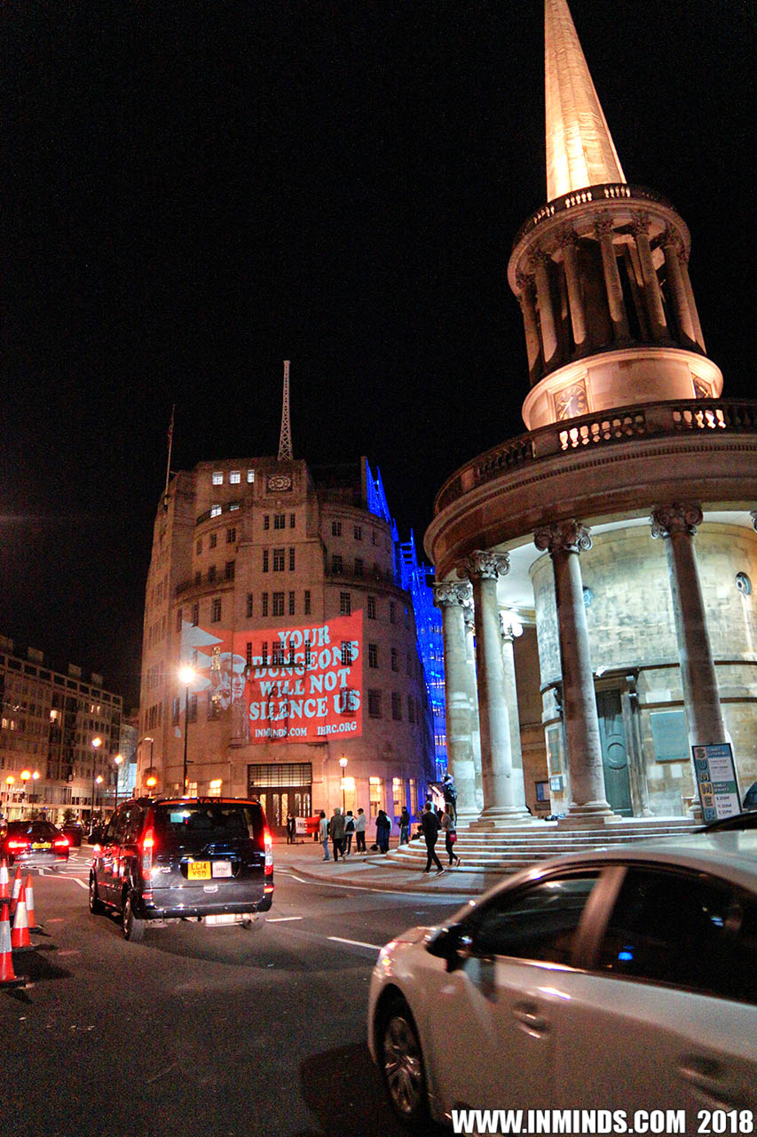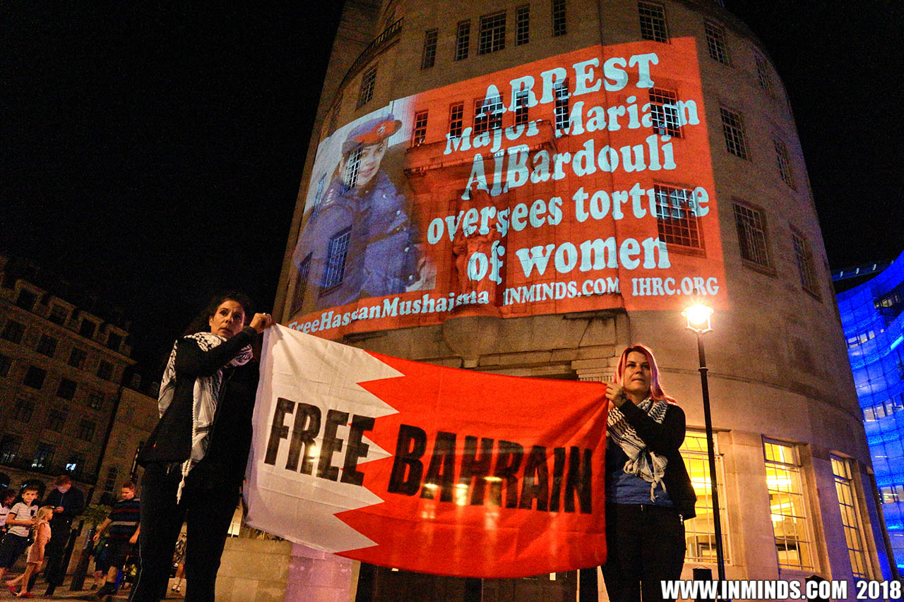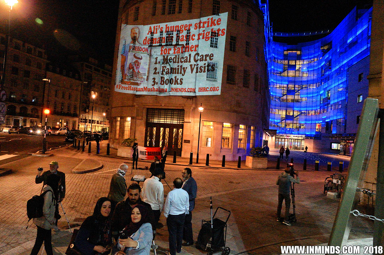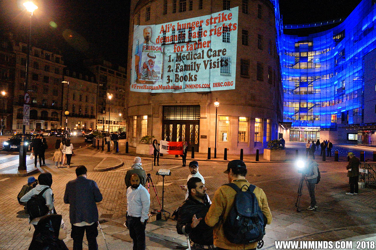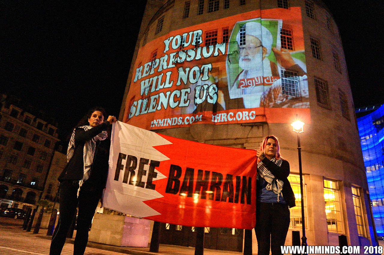 Inminds chair Abbas Ali added "Hassan Mushaima is one of thousands of political prisoners caged in Bahrain since the peoples peaceful uprising, demanding human rights and democracy. Each imprisoned victim of this regime, abducted, tortured and caged by UK trained thugs, has a story of suffering and resistance to tell. All are all ignored by the BBC. So we used the walls of the BBC to shine a light, to show a glimpse of some of their tragic stories. Their stories also feature villains, torturers.. so we also name and shame a few of them."