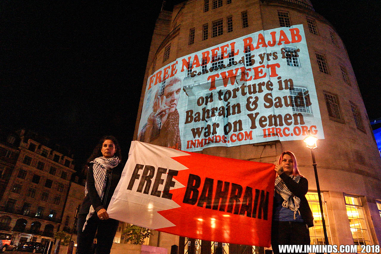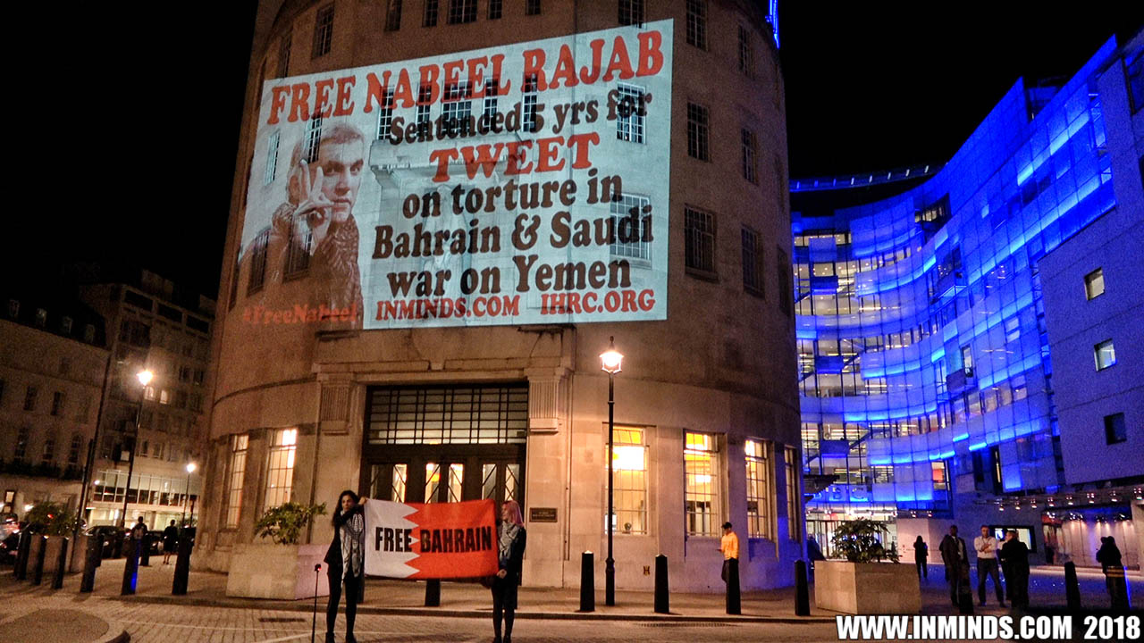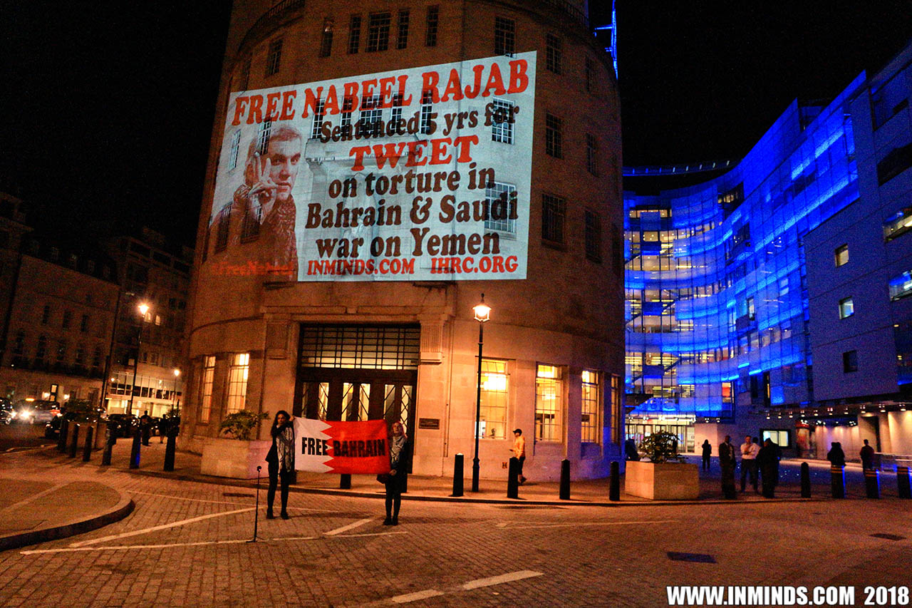 Inminds chair Abbas Ali said "On his birthday we show our solidarity with Nabeel Rajab by projecting his image on the BBC, demanding his immediate and unconditional freedom. The UK government has shamelessly ignored the UN ruling and continues to do business as usual with Bahrain. It is the responsibility of the media to hold up a mirror to those in power to show these truths, the BBC instead is busy whitewashing Bahrain's crimes to facilitate the UK governments cosy relationship with the brutal Khalifa dictatorship."