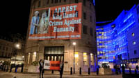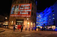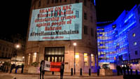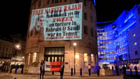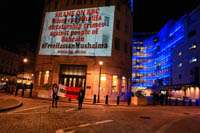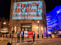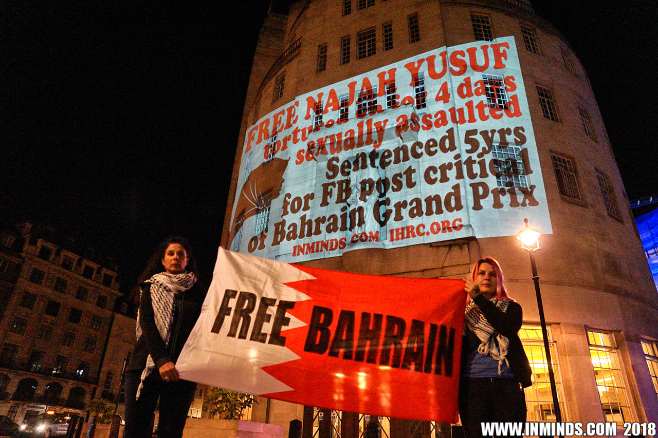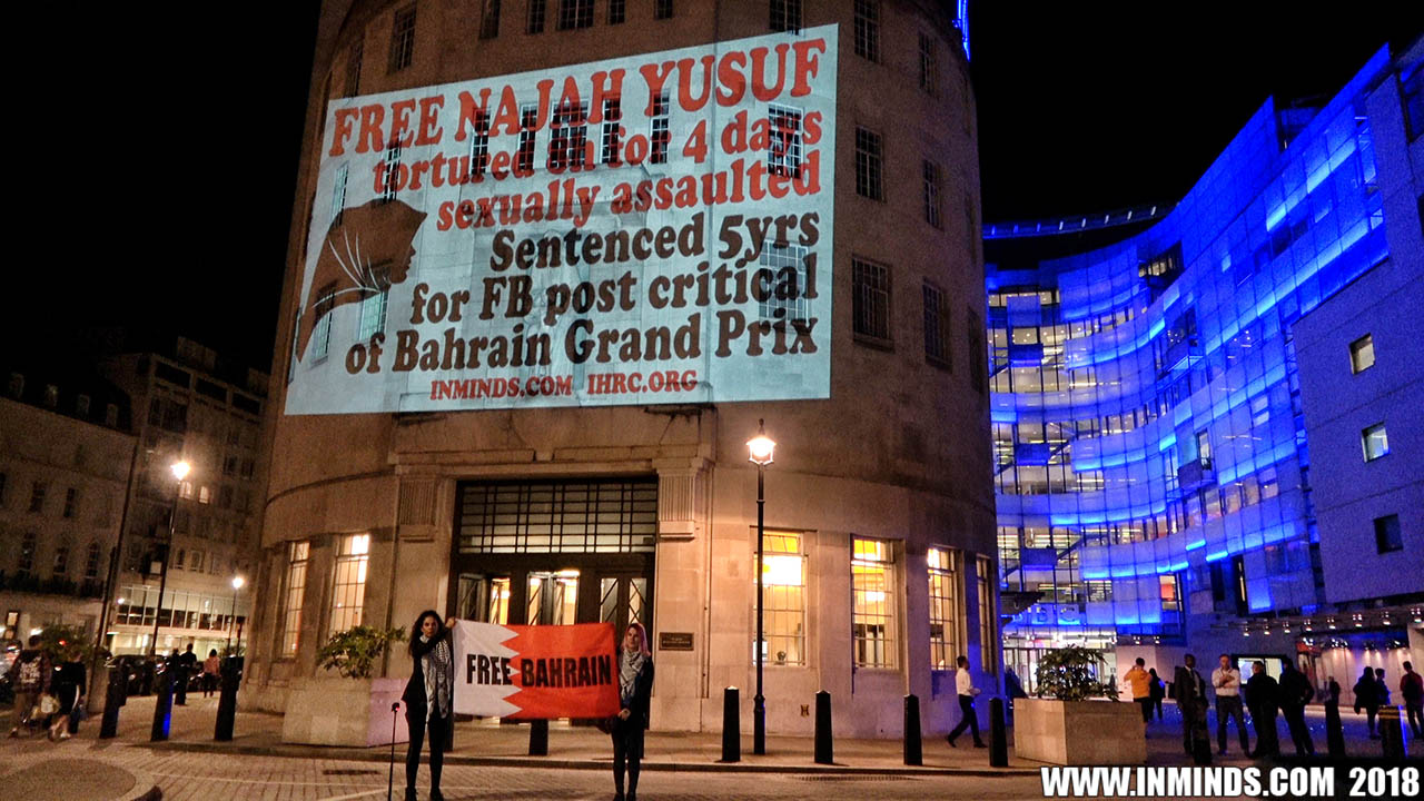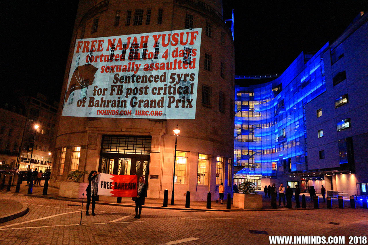 Inminds chair Abbas Ali said "On his birthday we show our solidarity with Nabeel Rajab by projecting his image on the BBC, demanding his immediate and unconditional freedom. The UK government has shamelessly ignored the UN ruling and continues to do business as usual with Bahrain. It is the responsibility of the media to hold up a mirror to those in power to show these truths, the BBC instead is busy whitewashing Bahrain's crimes to facilitate the UK governments cosy relationship with the brutal Khalifa dictatorship."