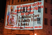 In prison the regime is denying Hassan Mushaima urgently needed medical treatment. His son Ali Mushaima is on hunger strike here in London, he is bravely camped outside the door of the Bahraini embassy, on hunger strike since 1st August. His demands are very basic – allow medical care for his father, allow his family to visit, and allow his father access to his books.