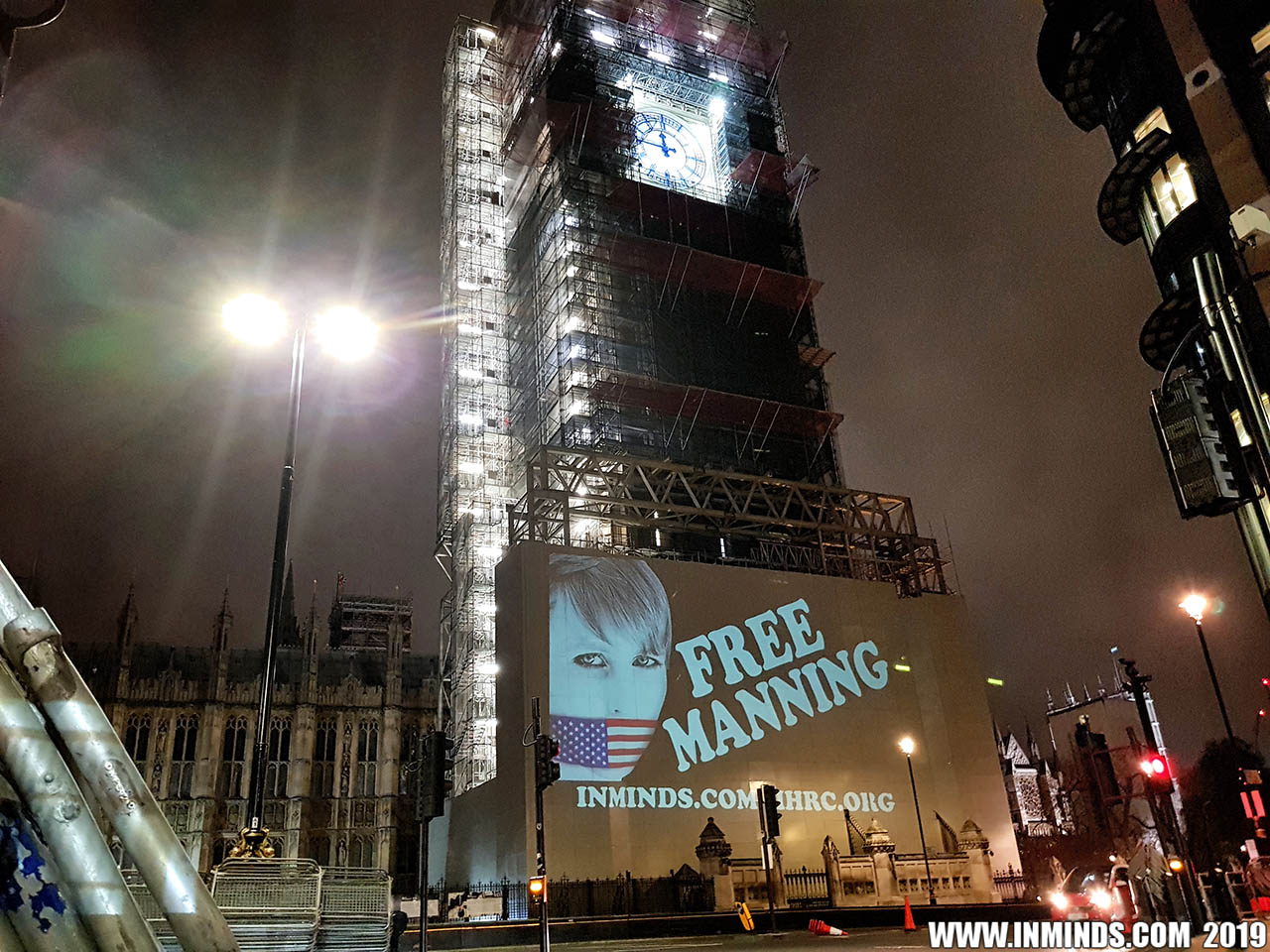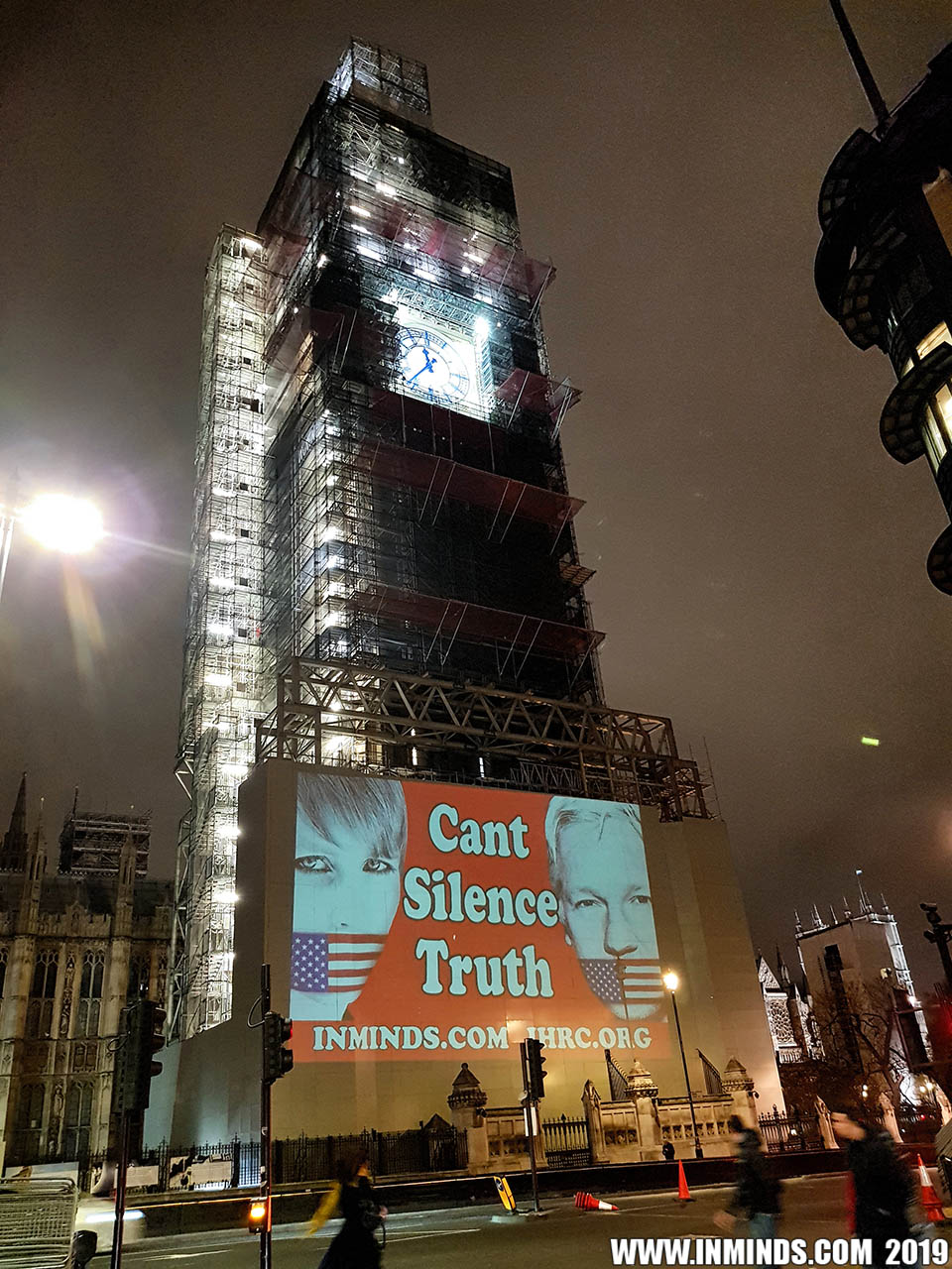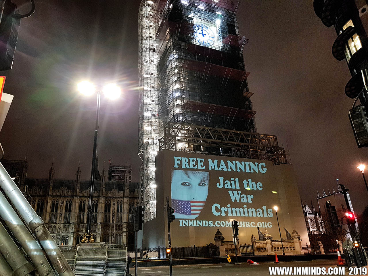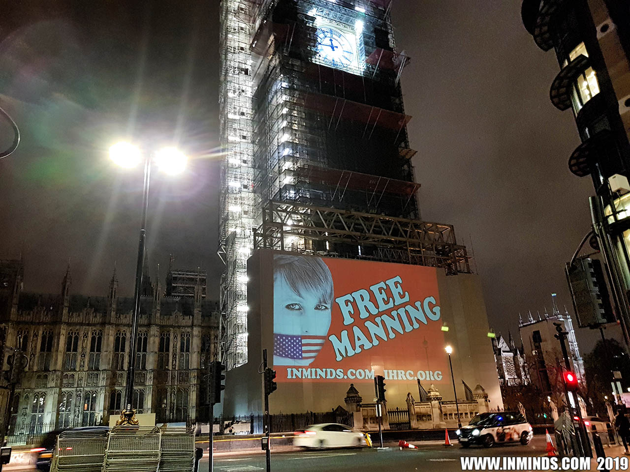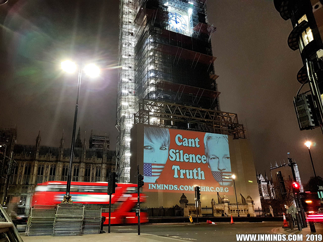 inminds 27 April 2019  Guerilla projection on Parliament demanding freedom for WikiLeaks founder Julian Assange and whistleblower Chelsea Manning.