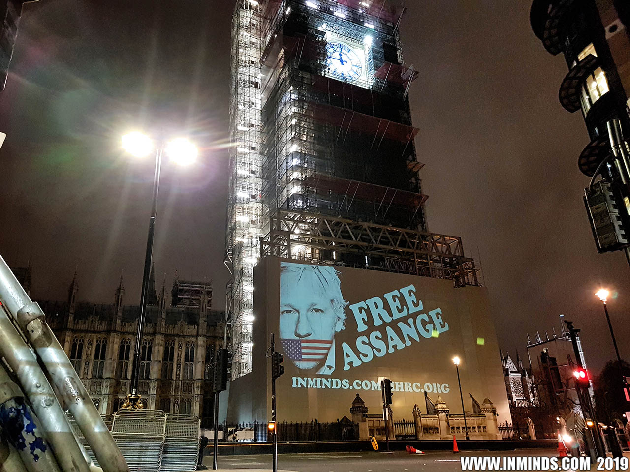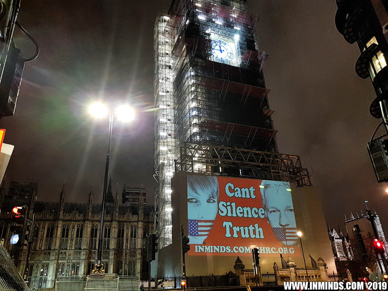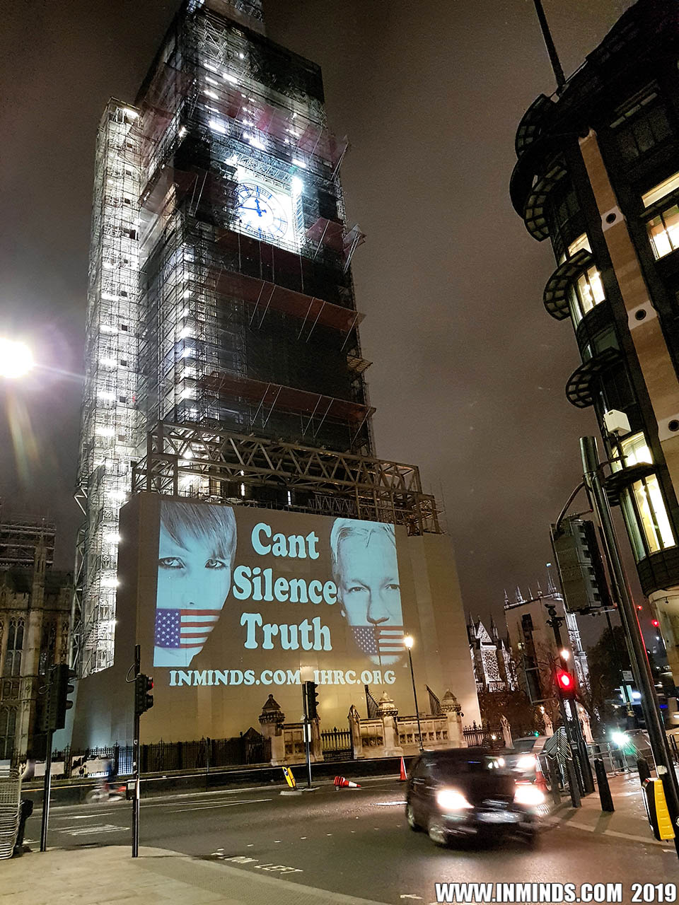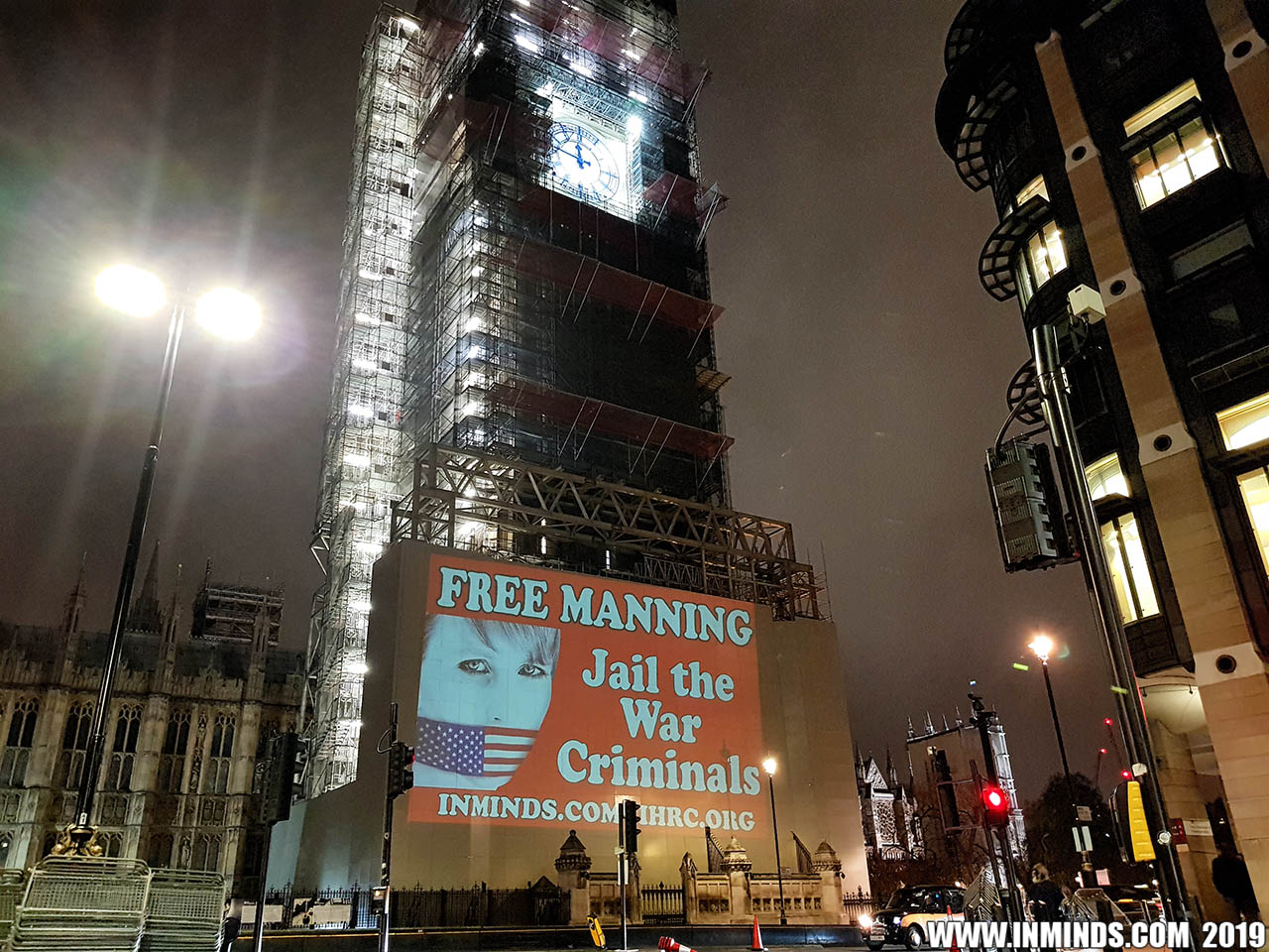 inminds 27 April 2019  Guerilla projection on Parliament demanding freedom for WikiLeaks founder Julian Assange and whistleblower Chelsea Manning.