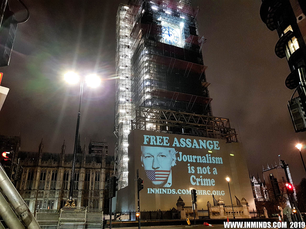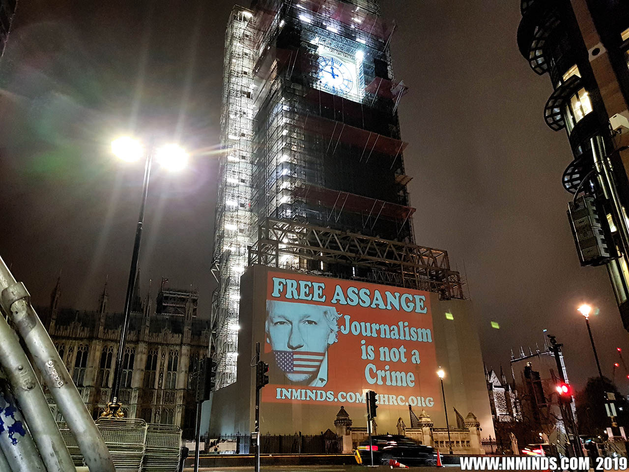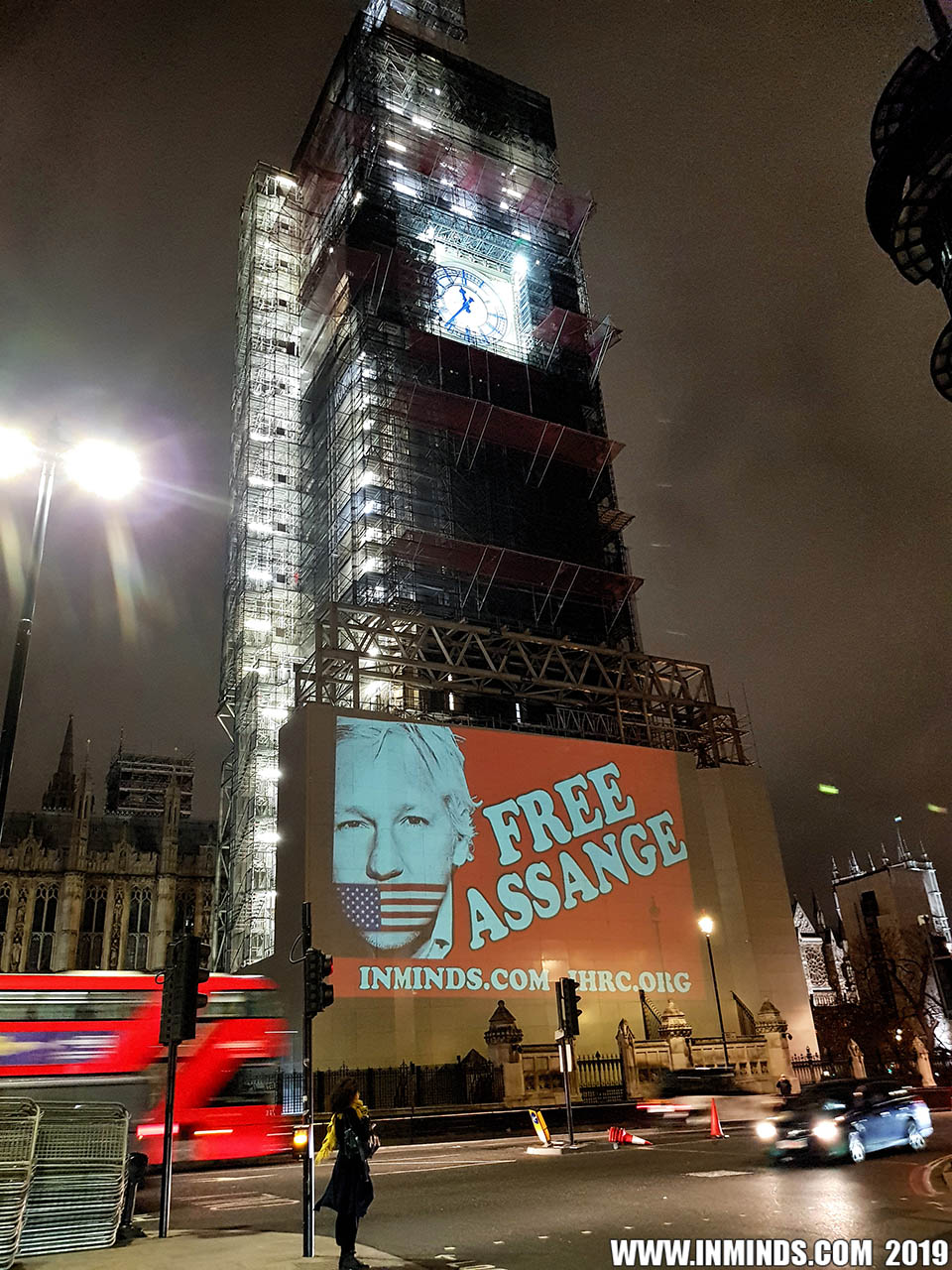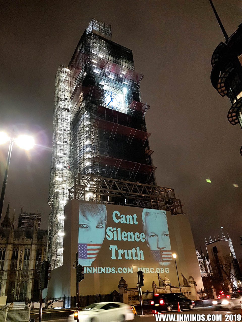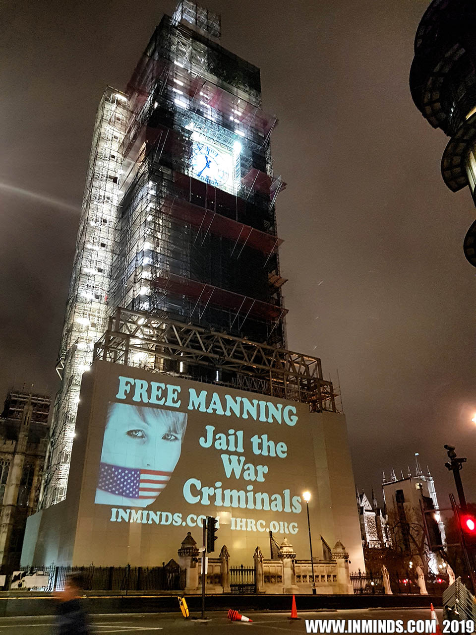 inminds 27 April 2019  Guerilla projection on Parliament demanding freedom for WikiLeaks founder Julian Assange and whistleblower Chelsea Manning.