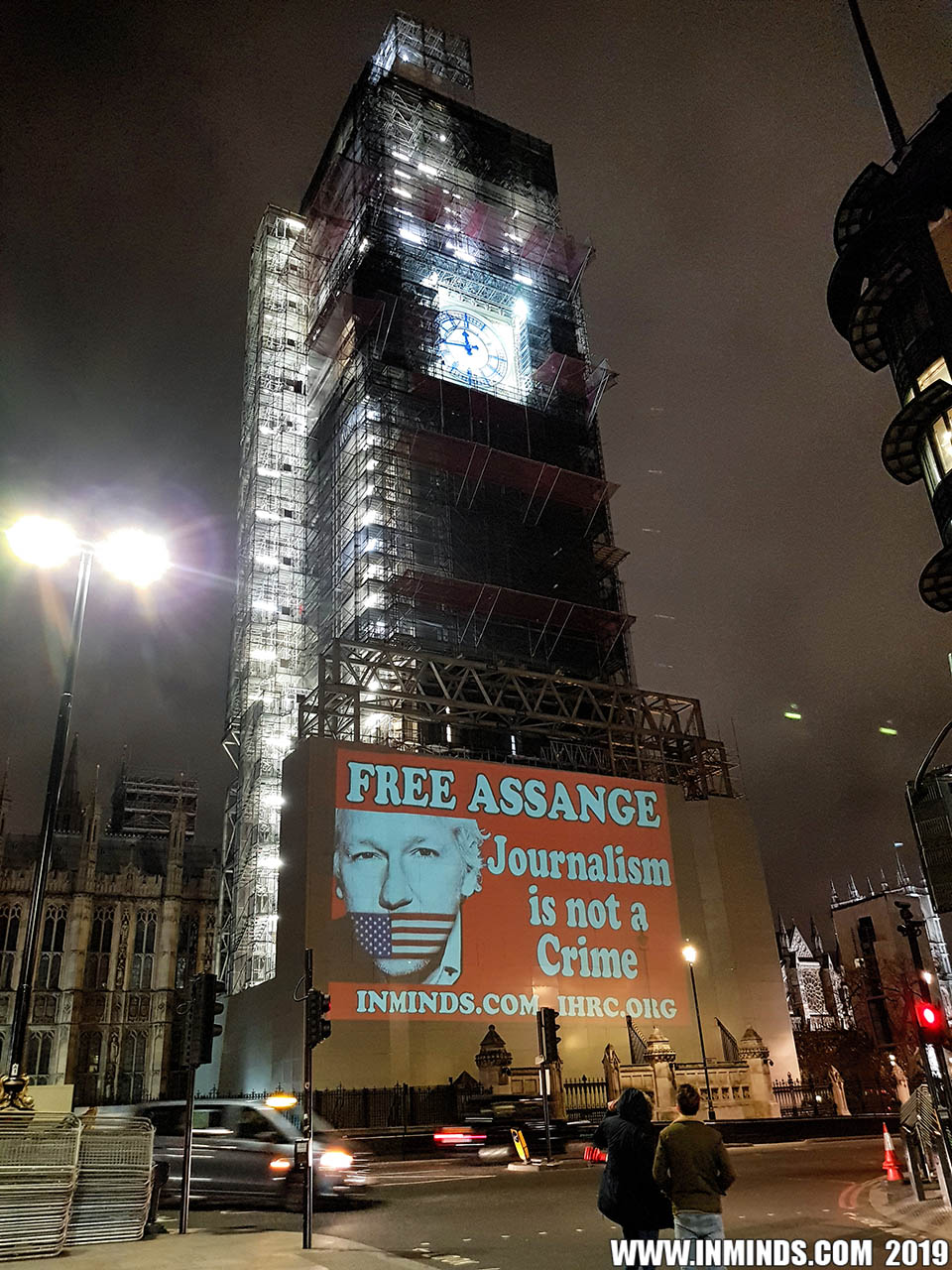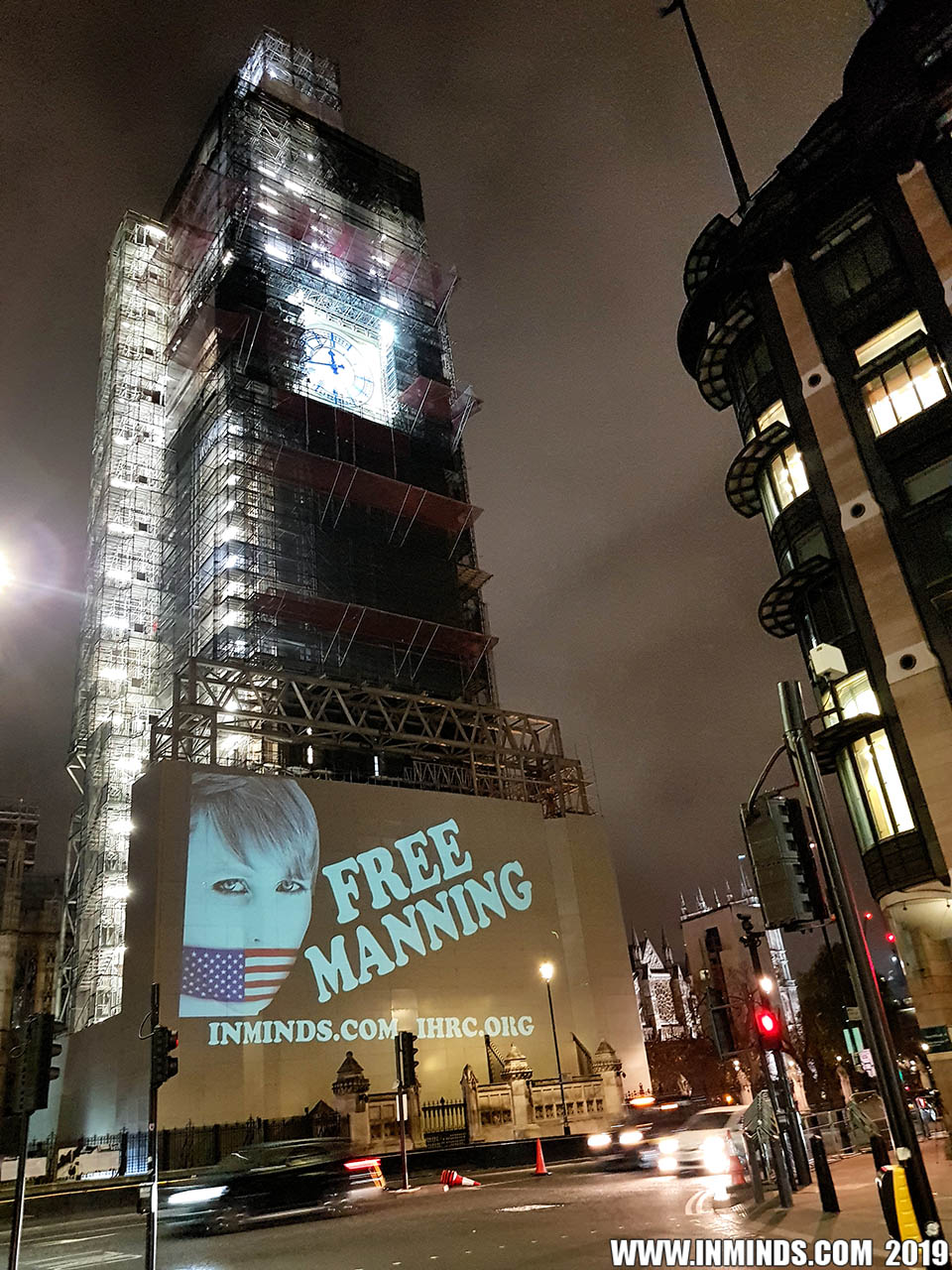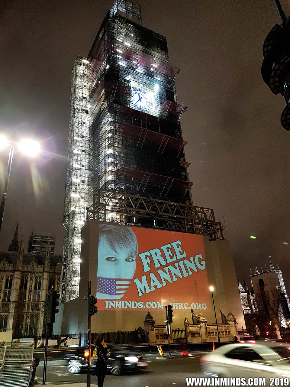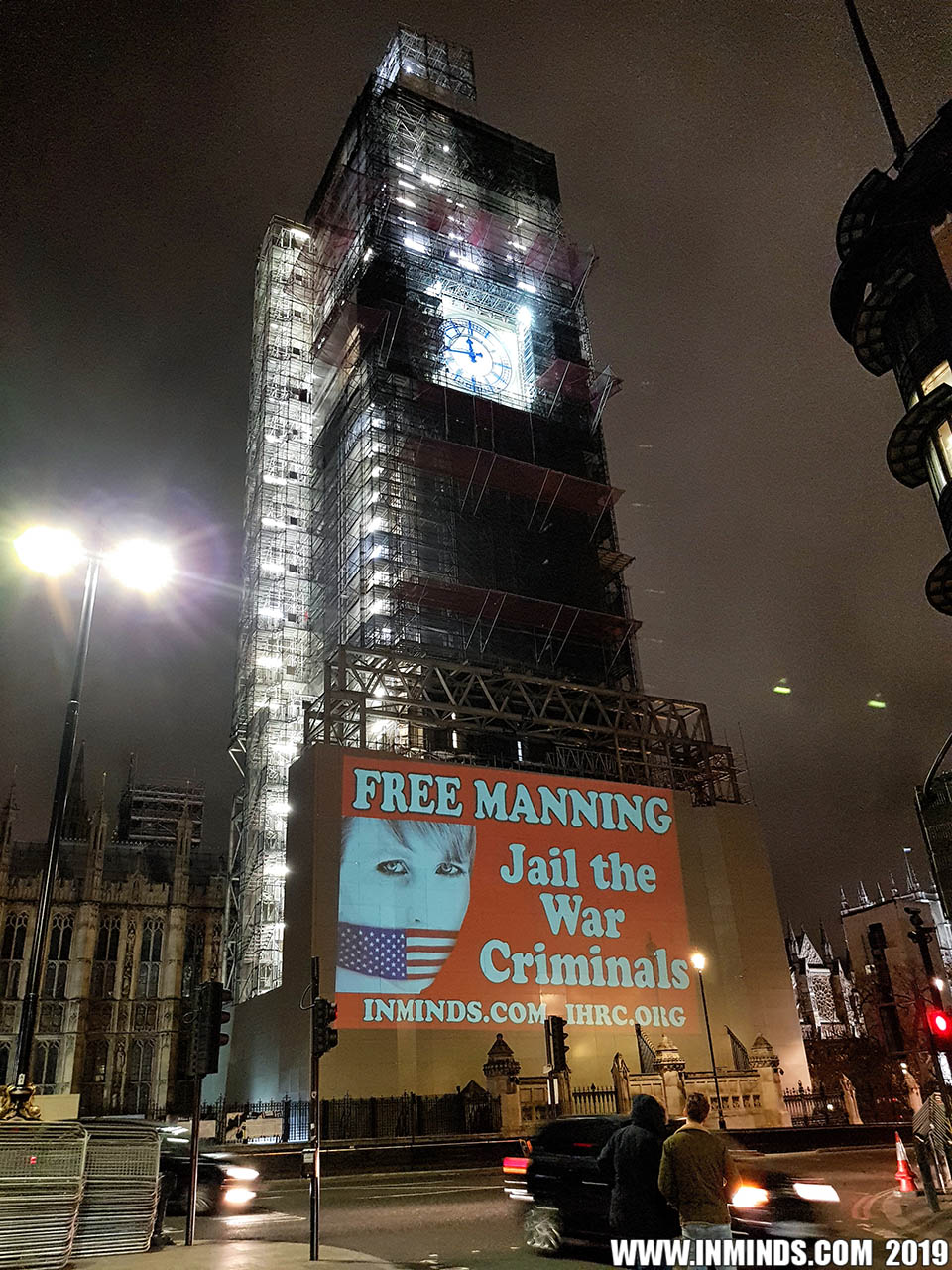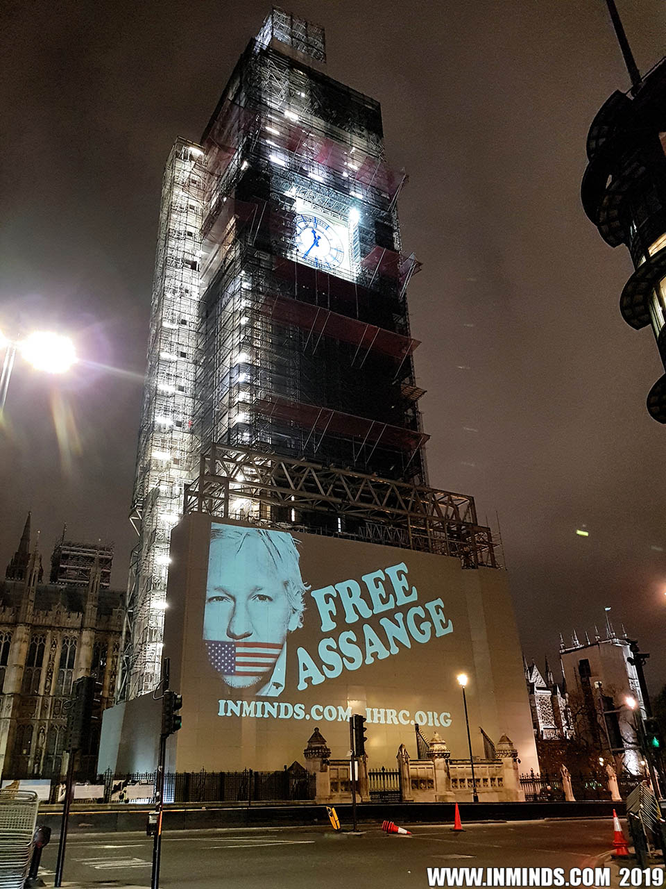 inminds 27 April 2019  Guerilla projection on Parliament demanding freedom for WikiLeaks founder Julian Assange and whistleblower Chelsea Manning.