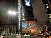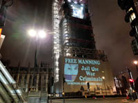 Guerilla projection on Parliament demanding freedom for WikiLeaks founder Julian Assange and whistleblower Chelsea Manning.