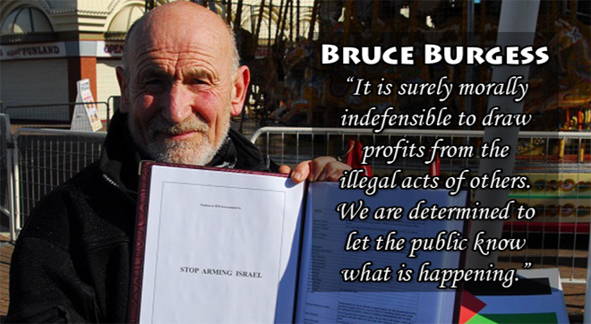 The quote above is from an interview Bruce Burgess gave to the Mecury Press in Liverpool on 16th August 2010: "The Ride for Palestine has had a very positive effect. It has raised awareness of our involvement in the actions of the Israeli army. We cannot escape being involved in their actions if we have supplied some of the means. The Ride will now probably become an annual event drawing attention to our complicity in different sectors. The one under active consideration for 2011 next year concerns the sale of goods in our supermarkets produced by illegal Israeli settlements. Whatever the exact legal position, it is surely morally indefensible to draw profits from the illegal acts of others. We are determined to let the public know what is happening."
